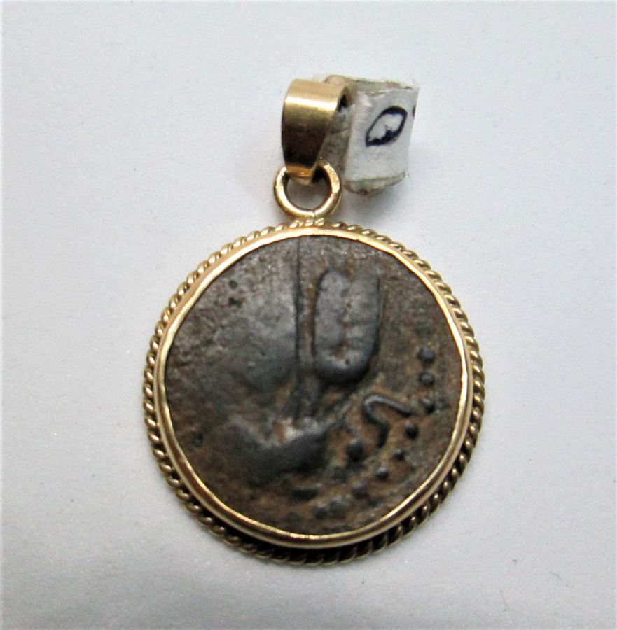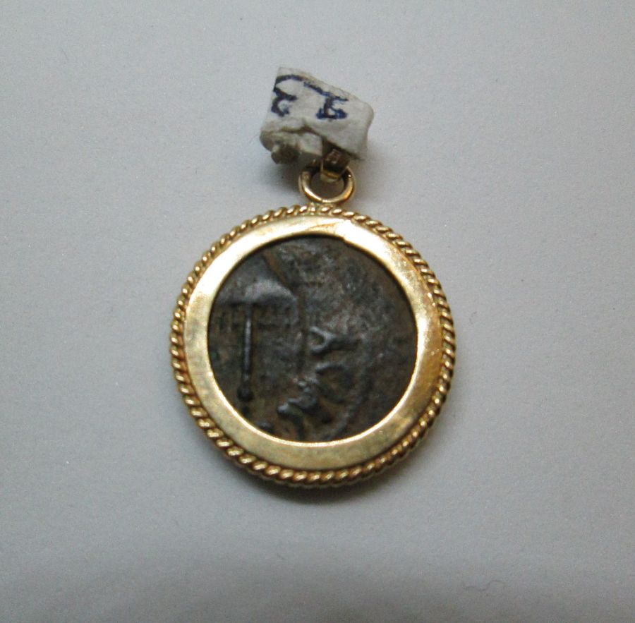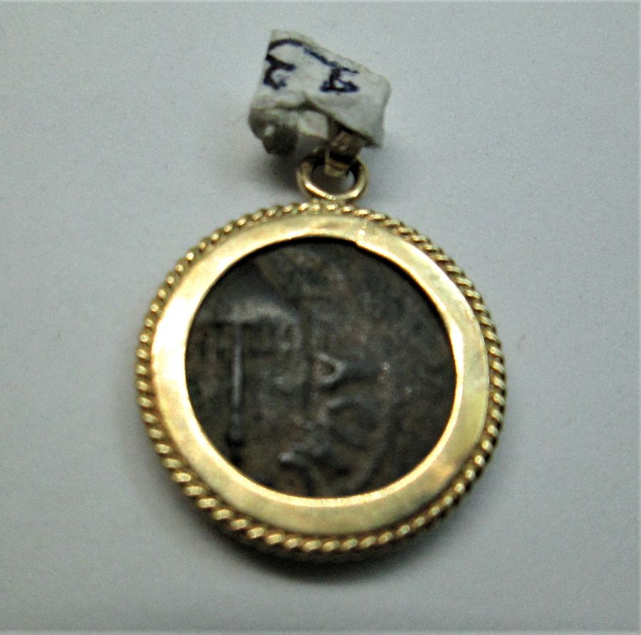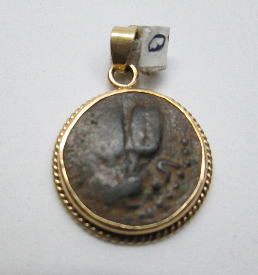 Handmade 14 Carat gold antique coin gold pendant set with ancient genuine coin made by S. Ghatan. 14 Carat gold antique coin gold pendant set with ancient genuine coin King Agrippa 1 dated 37-44 AD, known as the famous ” widow’s mite”.