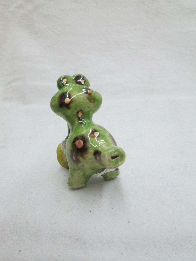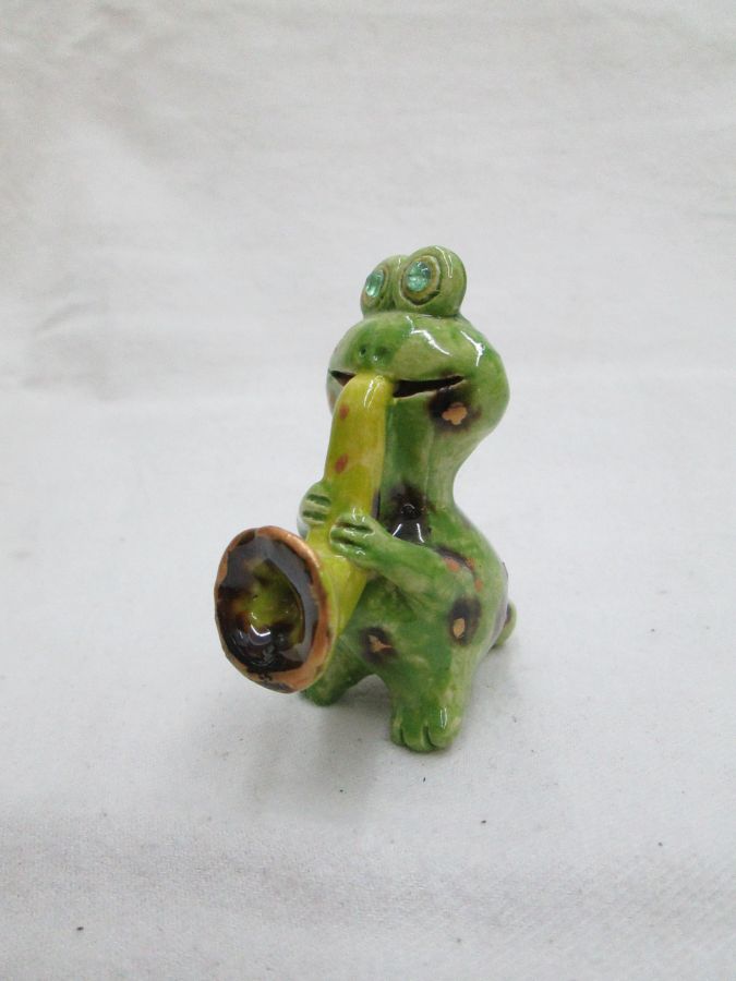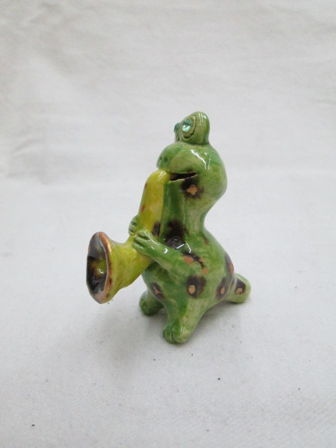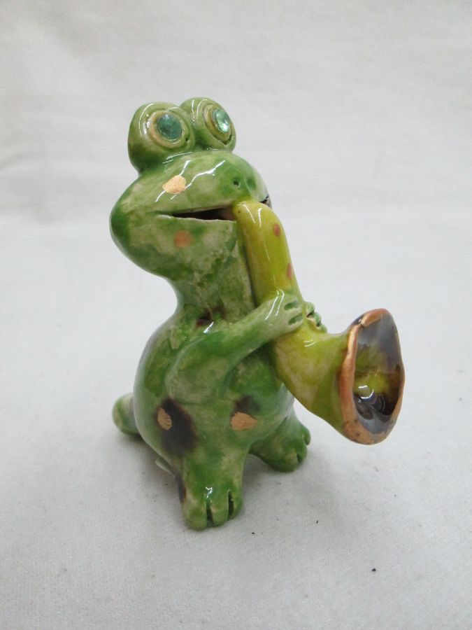 Glazed ceramic frog playing jazz sculpture is a musical whistle too. Handmade glazed ceramic frog playing jazz, it is also a whistle made by T. Labok. Dimension 6.8 cm X 6.1 cm X 3.3 cm approximately.