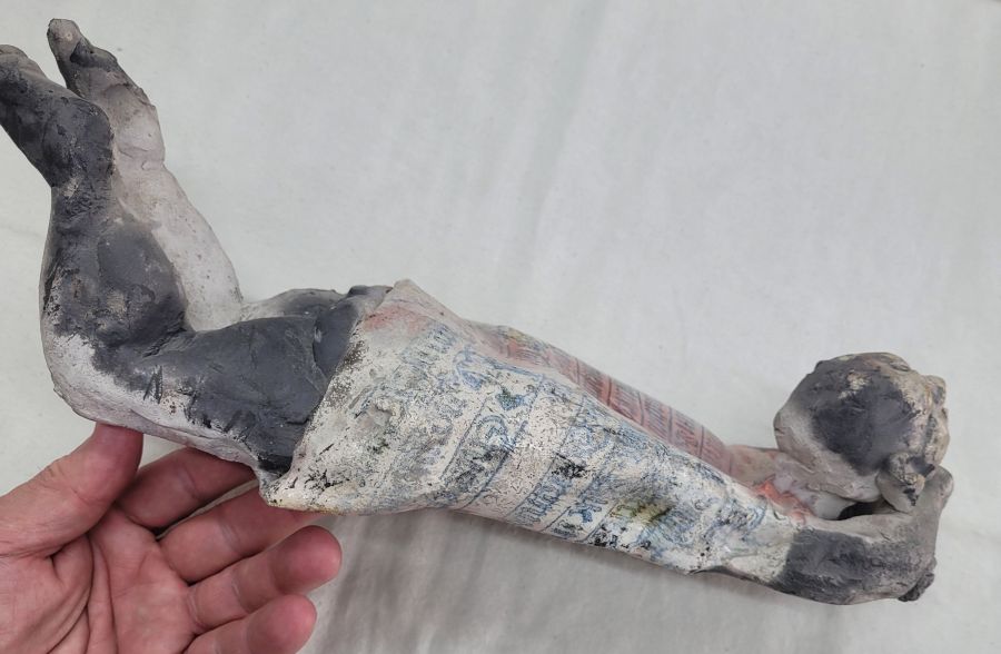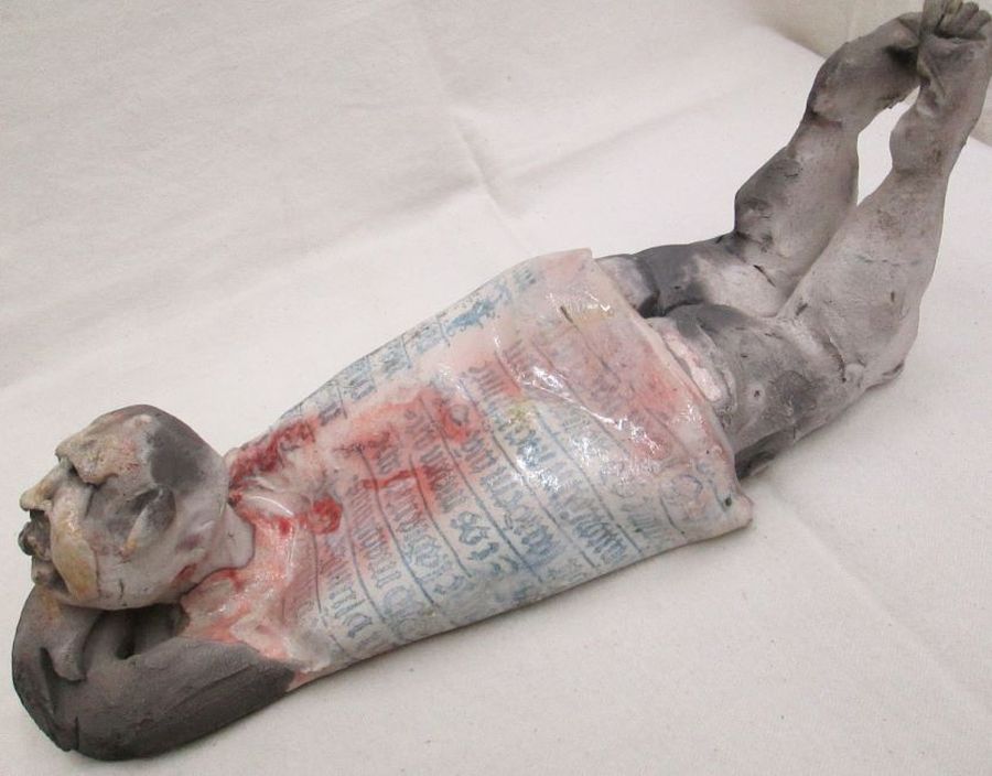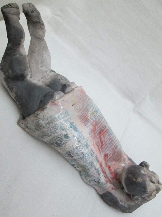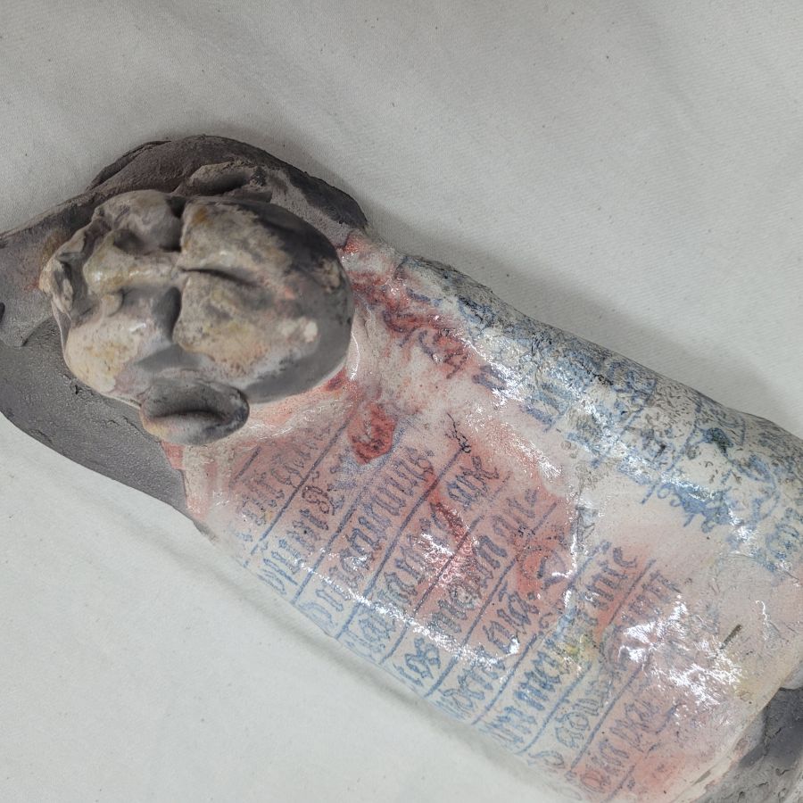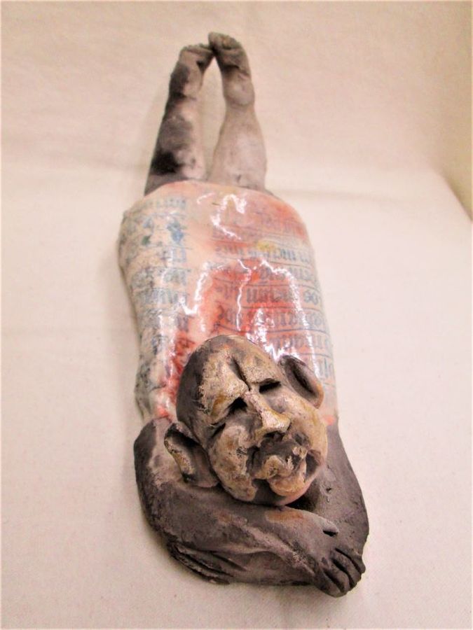 Ceramic Sculptures Shabby Man Handmade. S.Factor has made this beautiful glazed Roku Ceramic Sculptures Shabby Man lying down enjoying the sun. His shirt has Gothic characteristics letters . Dimension 35 cm X 12 cm X 11.8 cm approximately.