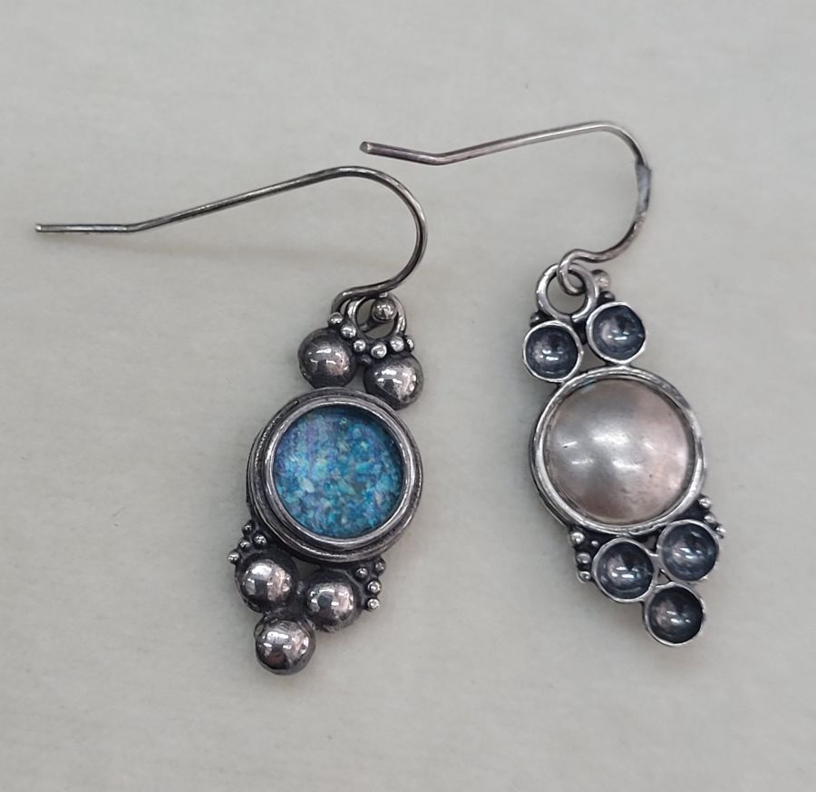 The use of broken Roman glass in jewelry making started some times in the 1950’s in Israel. There were an abundant quantity of broken Roman glass found in many of the excavations in Israel. Unfortunately many of the beautiful glass pieces were found broken. In ancient times, glass making industry, was in the Mediterranean countries , because of the presence of huge amount of sand. The Romans conquered the middle East and expanded the demand for glass. As a result, the industry expanded and produced different vessels for the rich communities. Also they have made new methods how to make better and more subtle glass vessels like glass blowing system. Until now , there are debates where the start of glass making started. Some assume it started in Phoenicia other say it began in much southern, in Judea. The most recent excavations hints that it started further to the east , in Mesopotamia.
