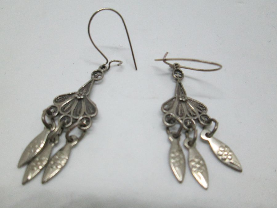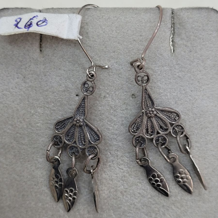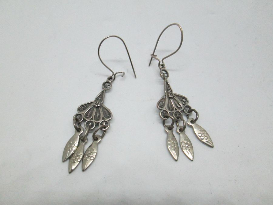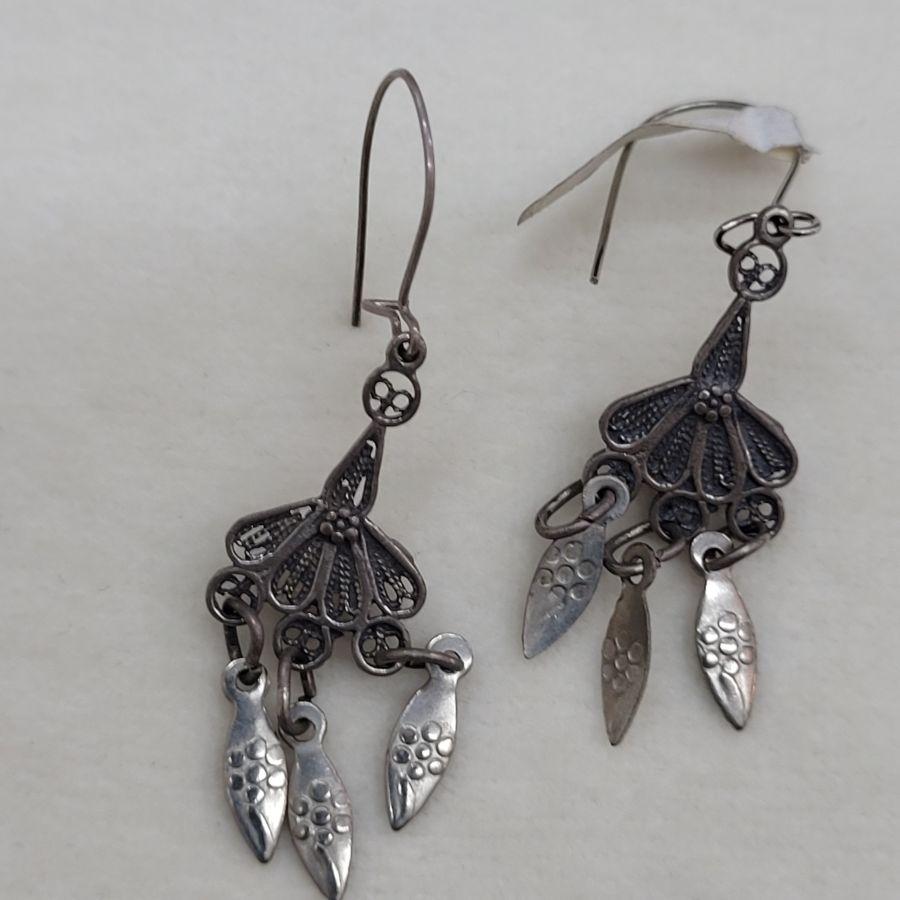 Handmade oxidized dangling Yemenite Filigree earrings. Sterling silver oxidized dangling Yemenite Filigree earrings with three hanging fishes. The hook can be changed to screw finding for non pieced ears by request. Dimension 1.7 cm X 5 cm approximately.
