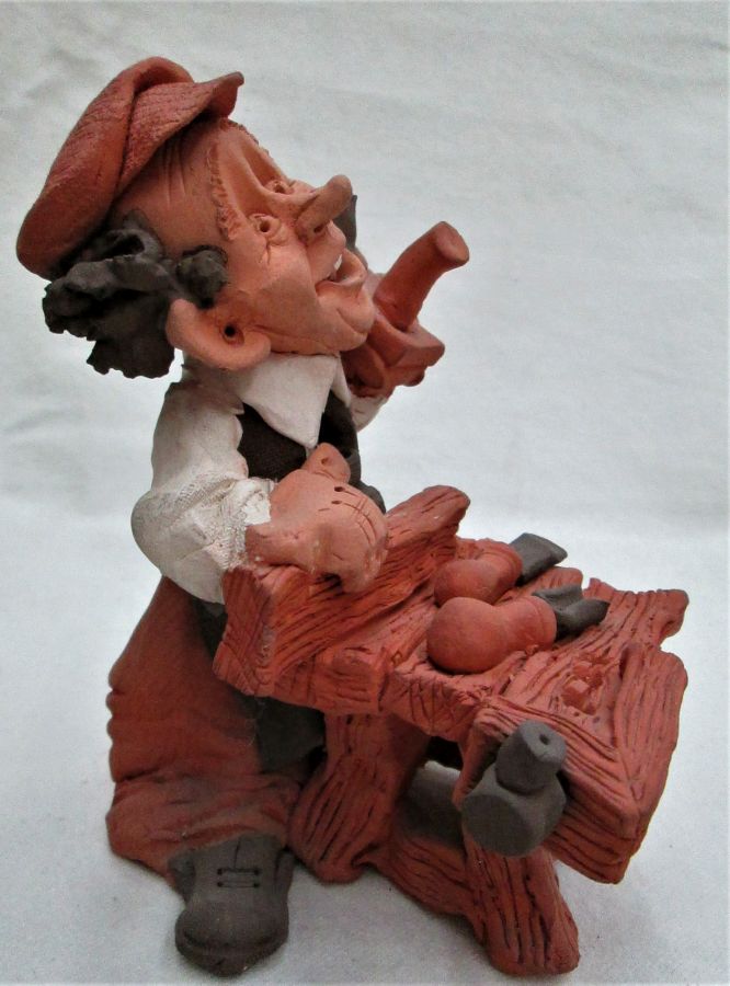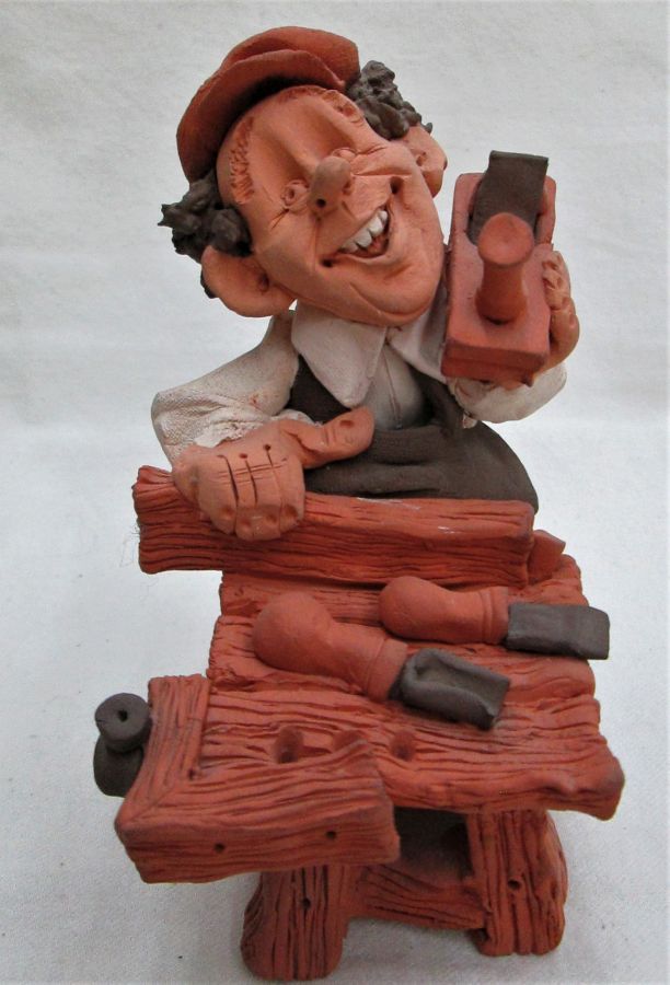 Dennis Pottery Carpenter Sculpture handmade. Handmade by Dennis Pottery Carpenter Sculpture. A traditional carpenter made by Dennis. I do have in stock a shoemaker by Dennis too. Dimension 14 cm X 10.4 cm X 13.9 cm approximately.