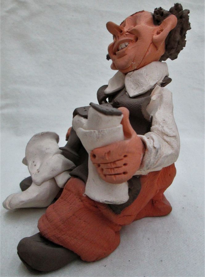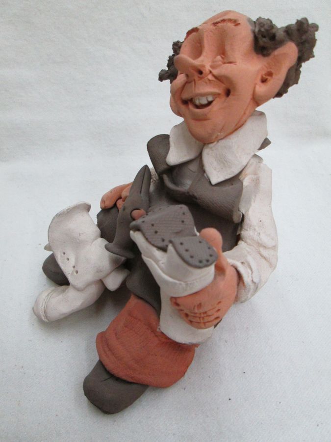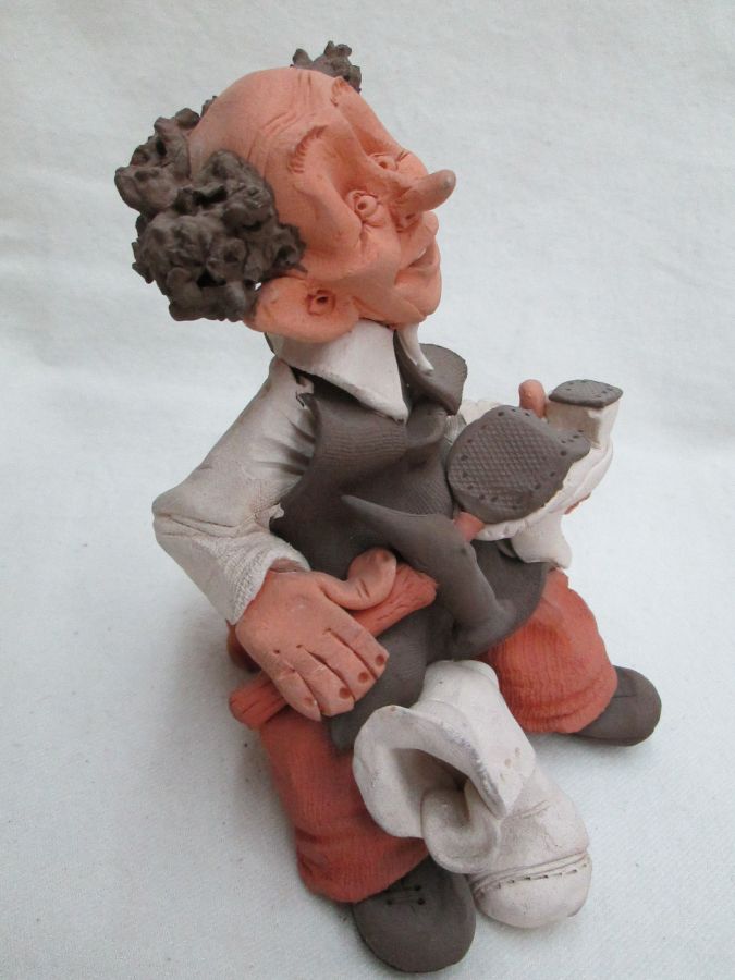 Dennis Shoemaker Pottery Sculpture handmade. Handmade by Dennis Shoemaker Pottery Sculpture. A traditional shoe maker made by Dennis. I do have in stock a carpenter sculpture made by Dennis. Dimension 12 cm X 10.4 cm X 10.9 cm approximately.