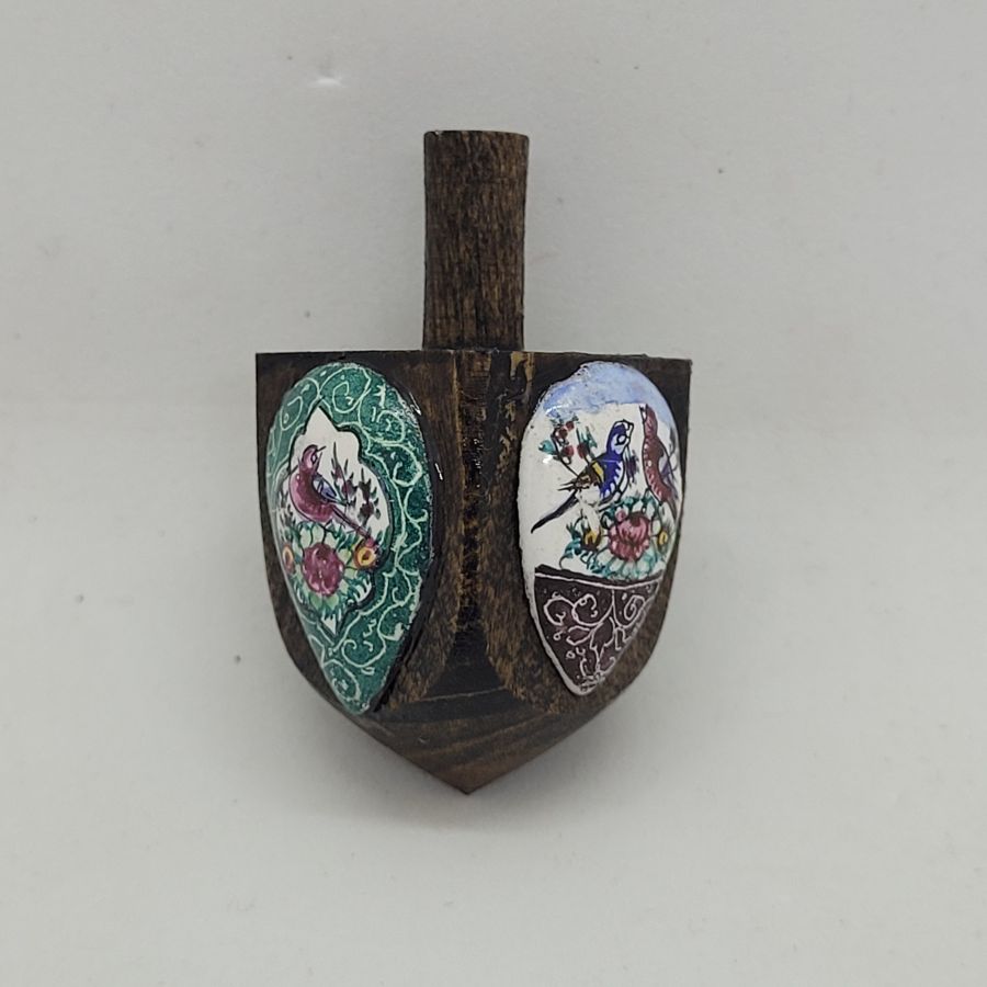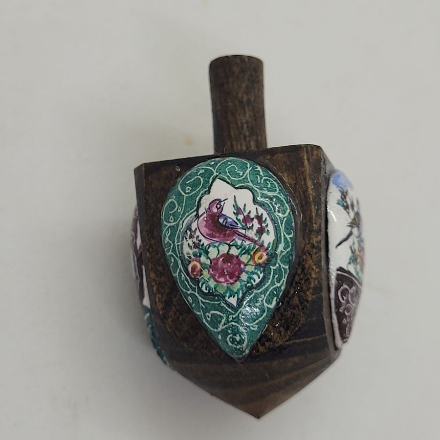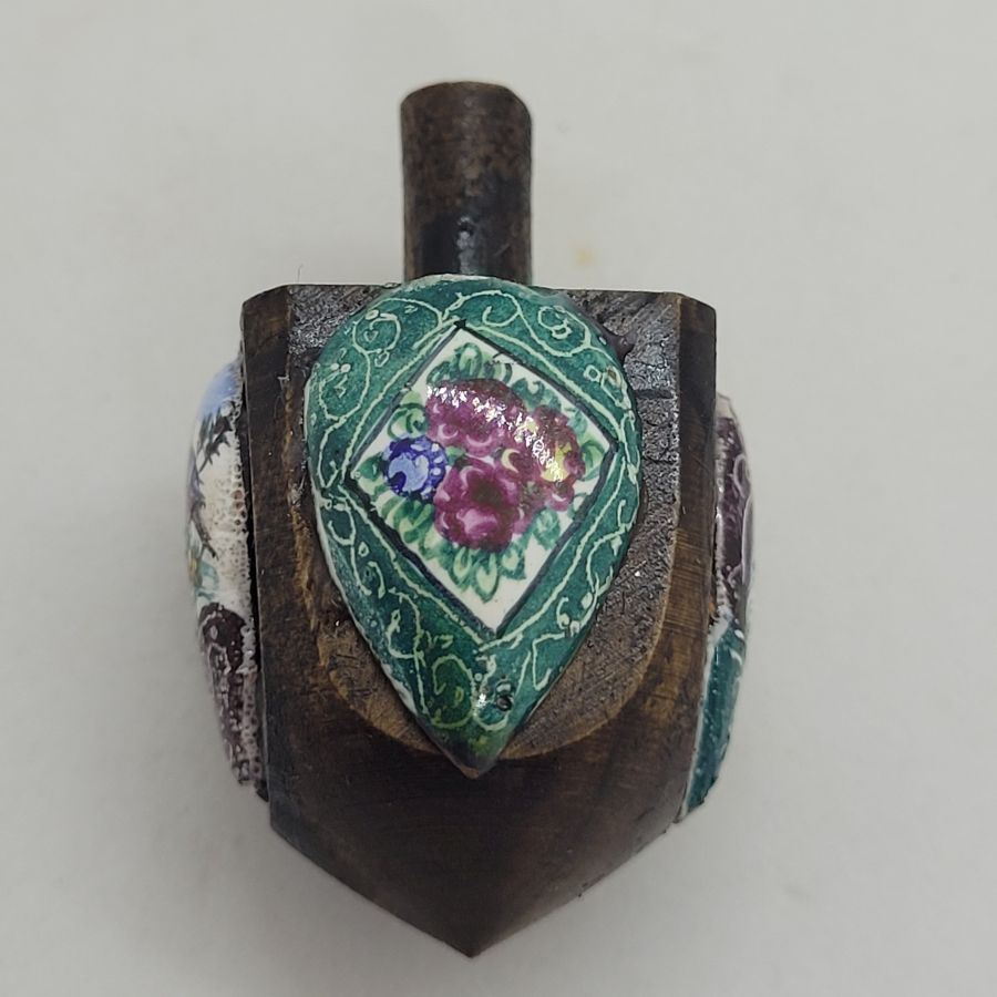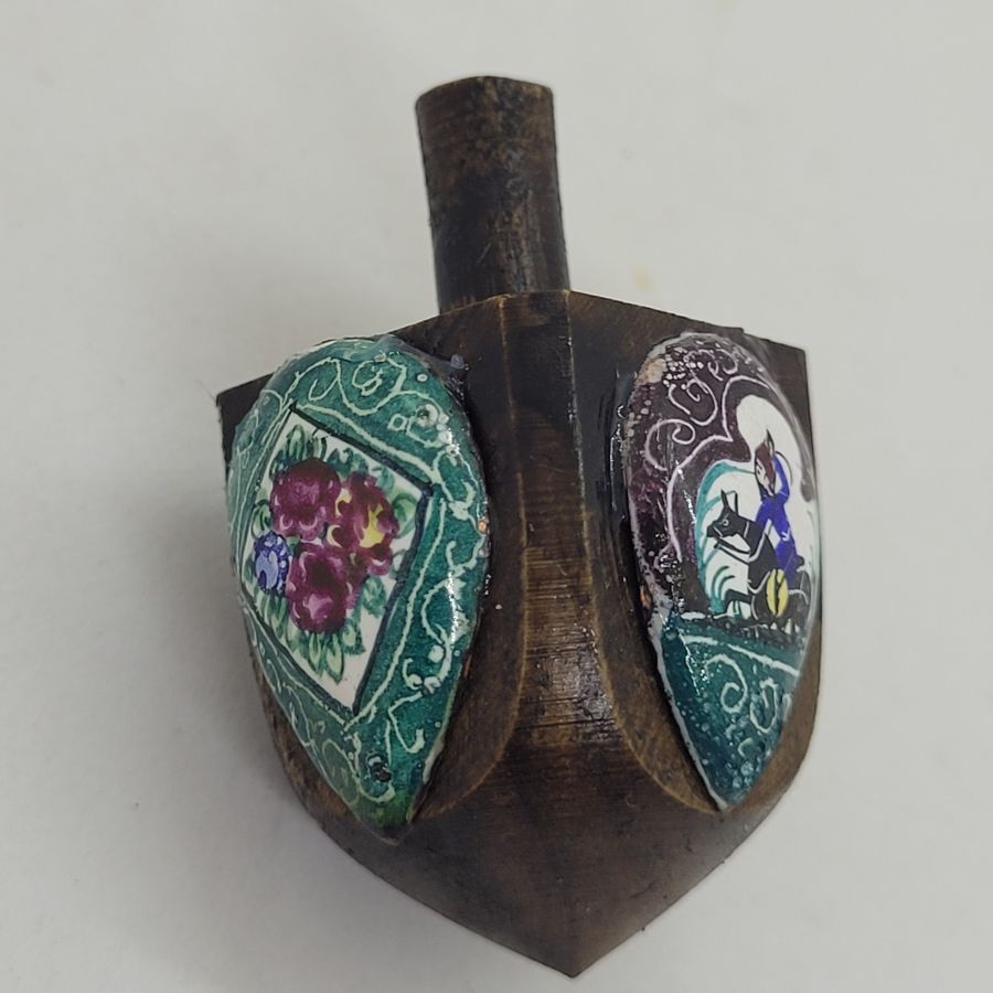 Chanuka Hanukah Dreidel tear drop enamel shape on wood Dreidel handmade. Handmade Hanukah Dreidel tear drop enamel shape with floral designs on wood Dreidel. Made by S. Ghatan ( Katan).