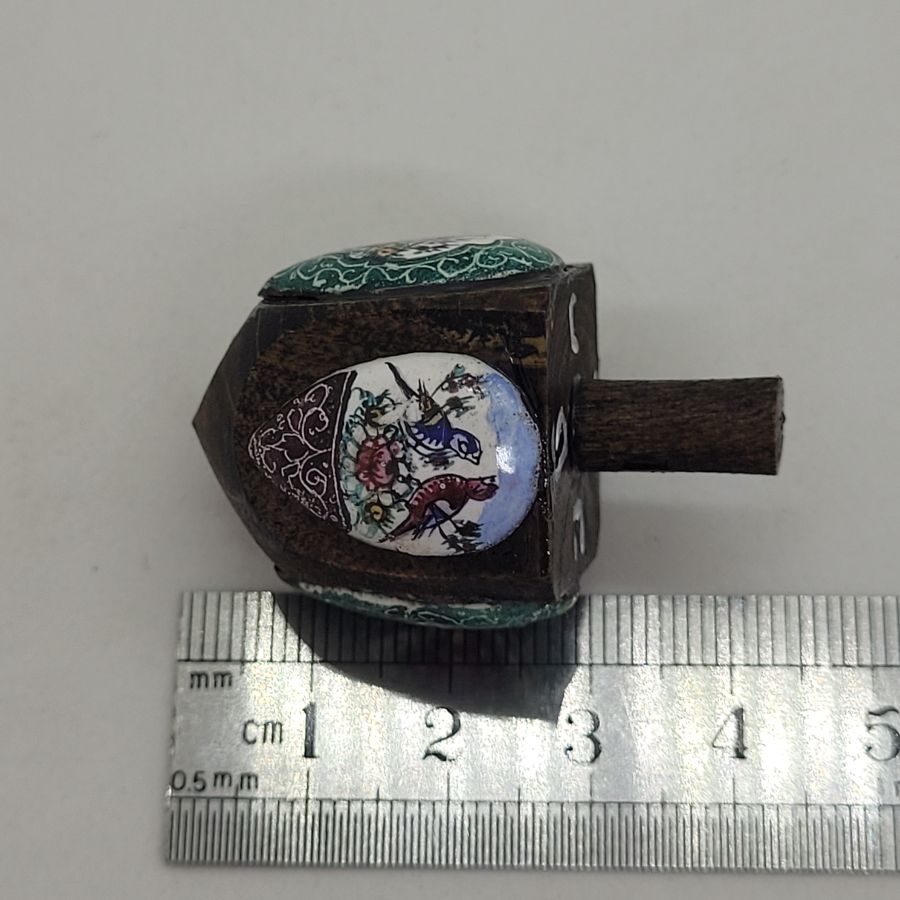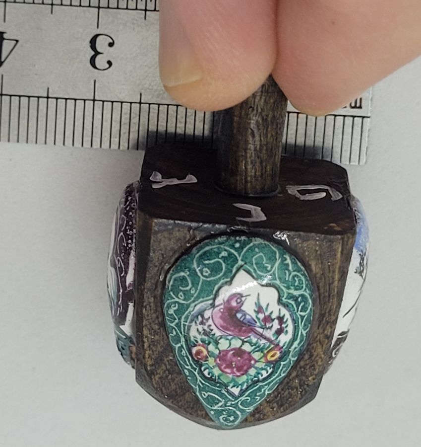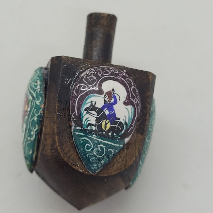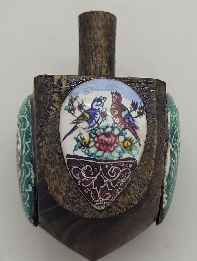Chanuka Hanukah Dreidel tear drop enamel shape on wood Dreidel handmade. Handmade Hanukah Dreidel tear drop enamel shape with floral designs on wood Dreidel. Made by S. Ghatan ( Katan).