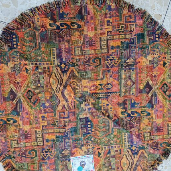 Druze round tablecloth orange handmade cotton. Handmade Druze round tablecloth orange, where each side is as beautiful because of the different shades of orange and yellow colors they have skillfully used. The Druze weaving has passed in Druze society for generation, and has been affected by the surrounding with meager affects for the best results.