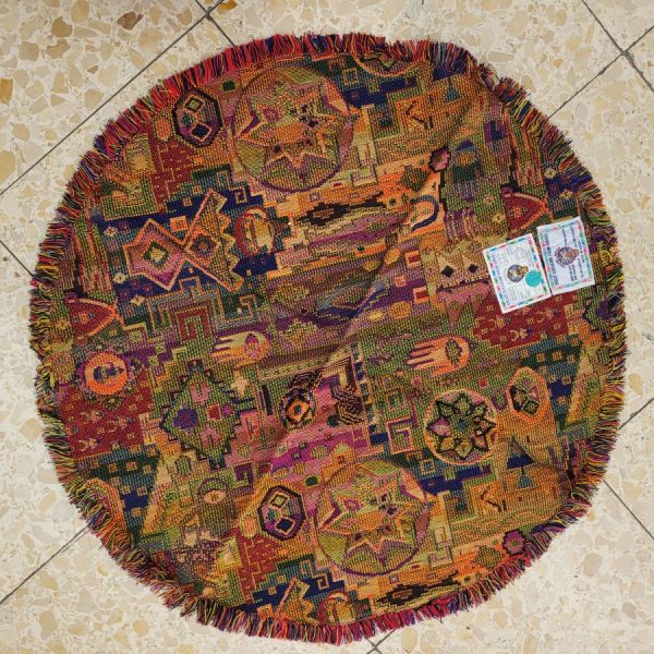 Druze round tablecloth yellow handmade cotton. Handmade Druze round tablecloth yellow, where each side is as beautiful because of the different shades of yellow colors they have skillfully used. The Druze weaving has passed in Druze society for generation, and has been affected by the surrounding with meager affects for the best results.