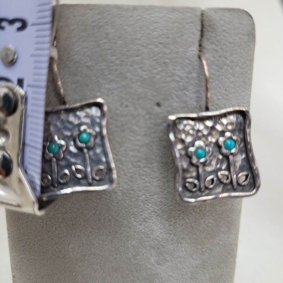 Handmade sterling silver earrings four Turquoises flowers stones set with four Turquoises stones shaped as growing flowers contemporary style. The hook in sterling silver earrings four Turquoises flowers can not be changed to screw finding for non pierced ears. Dimension 1.6 cm X 1.7 cm approximately.
