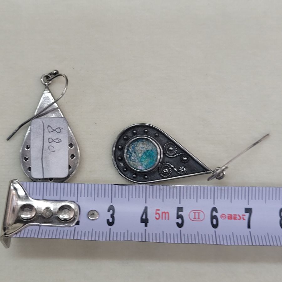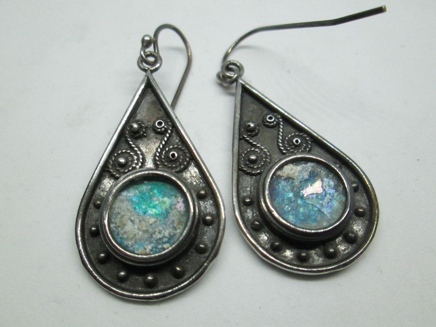 Tear drop shape sterling silver Yemenite filigree earrings Roman glass handmade. Handmade sterling silver Yemenite filigree earrings Roman glass set with genuine antique Roman glass. Dimension 1.8 cm X 3.2 cm approximately.