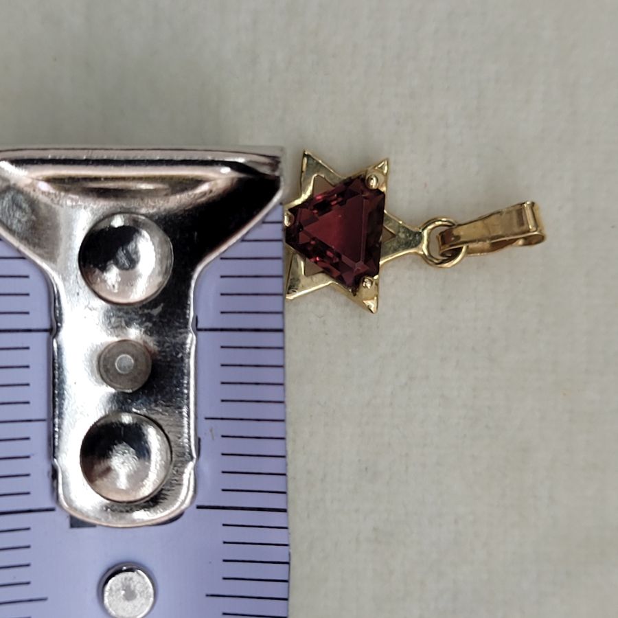 Handmade faceted Garnet Magen David star 14 carat gold pendant. Handmade 14 carat gold faceted Garnet Magen David star triangle shape red faceted Garnet stone forming a David star pendant.