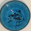 Vintage handmade blue glazed ceramic bowl peacock design in center made in Middle East early 20th century. The potter has drawn a peacock inside bowl and floral décor around outside.