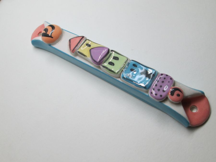 Handmade glazed ceramic Mezuzah pastel colors with houses. Glazed ceramic Mezuzah pastel colors with houses suitable for parchment up to 10 cm length. Dimension 2 cm X 2.25 cm X 15.7 cm approximately.