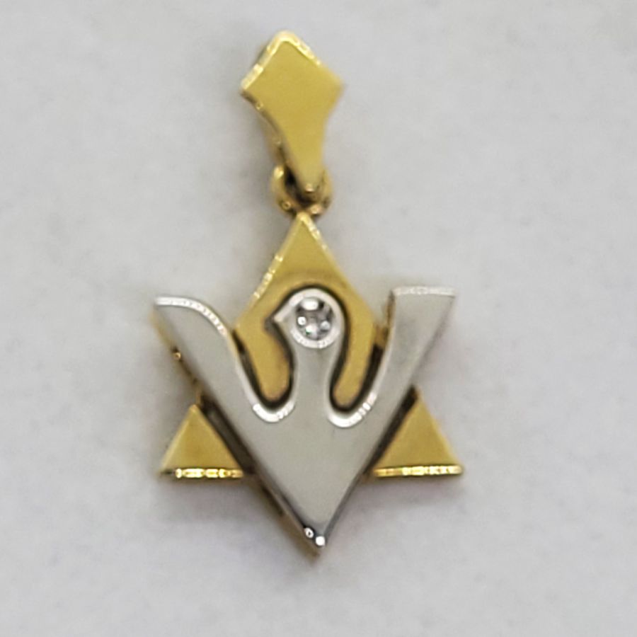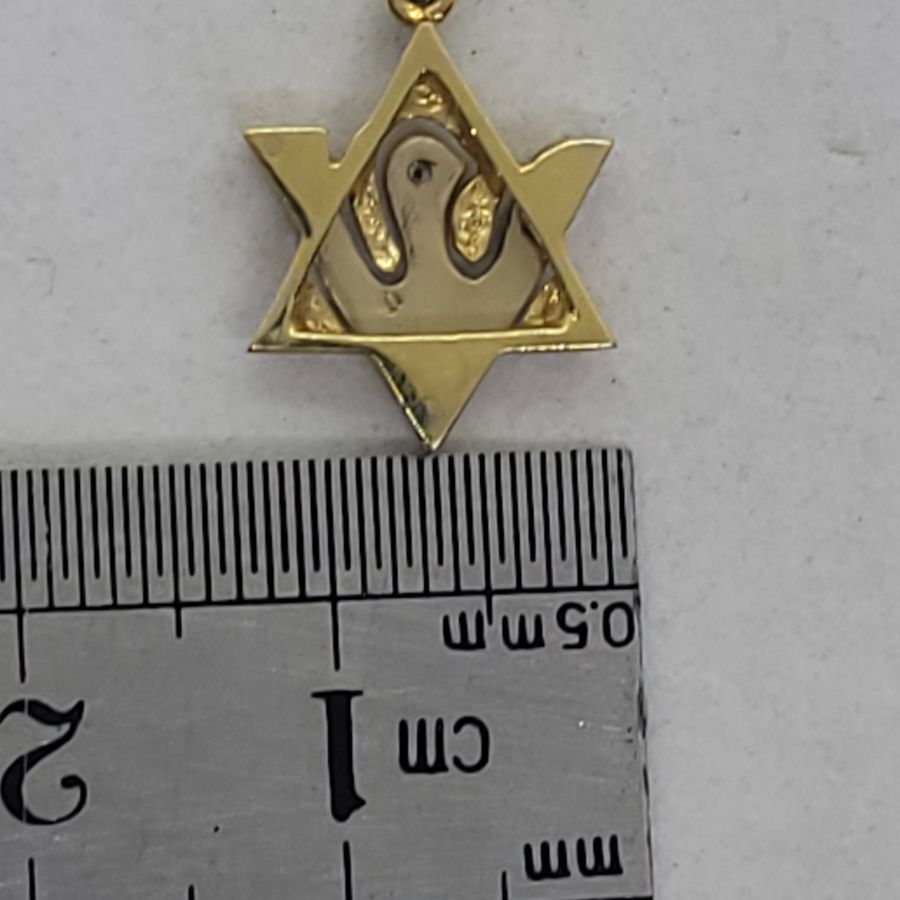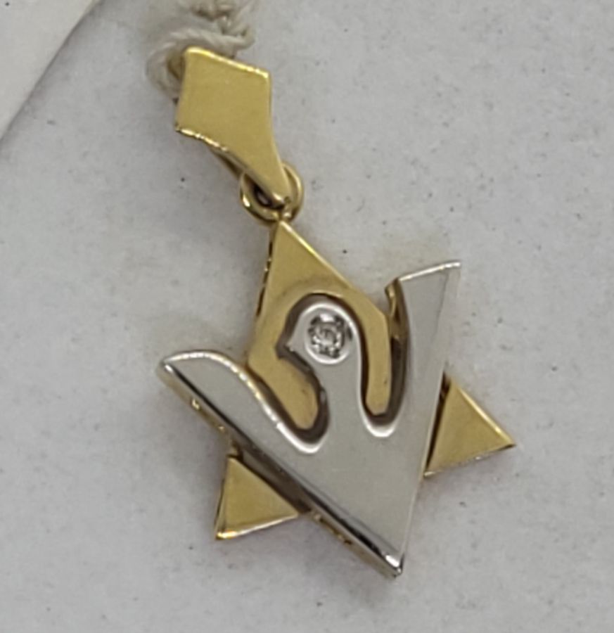 18 Carat white and yellow gold Magen David pendant Diamonds dove 1 Diamonds set in. White and yellow gold Magen David pendant dove shape handmade 18 carat white gold set in dove 1 genuine white diamonds total weight 2 pts, VVS clarity.
