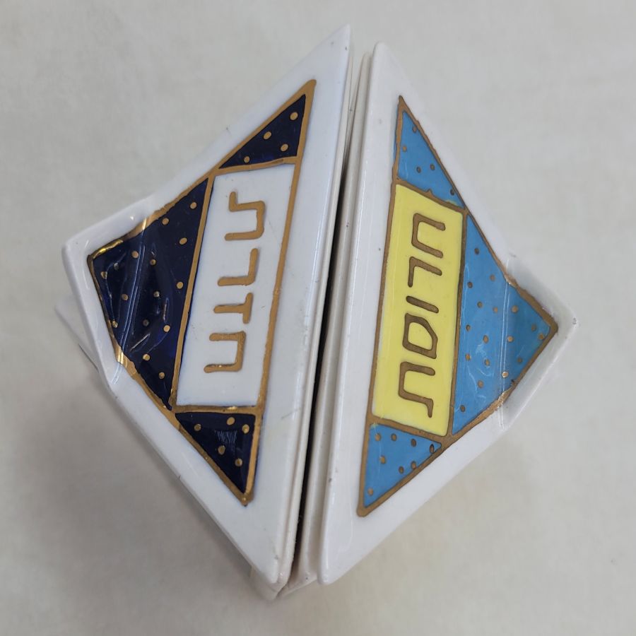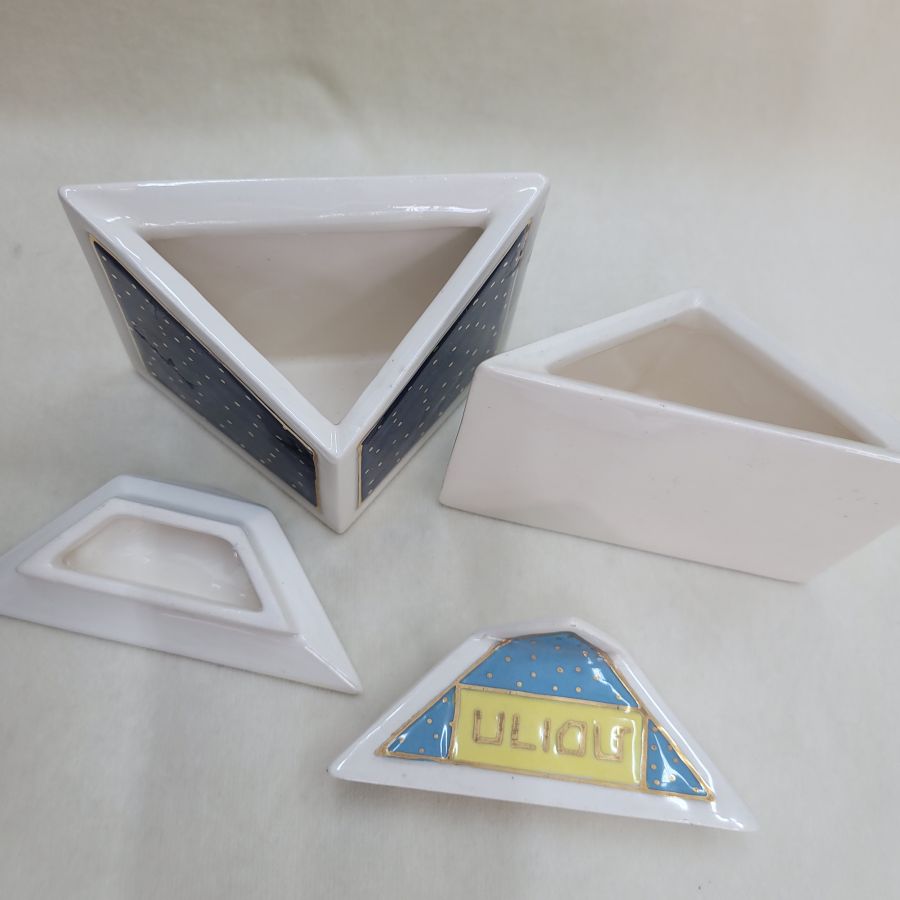 Passover two Haroset Hazeret dishes ceramic handmade by Orr. Contemporary style two separate Passover Haroset Hazeret dishes ceramic triangle shape blue, Yellow and white colors and small gold stars made by Orr.