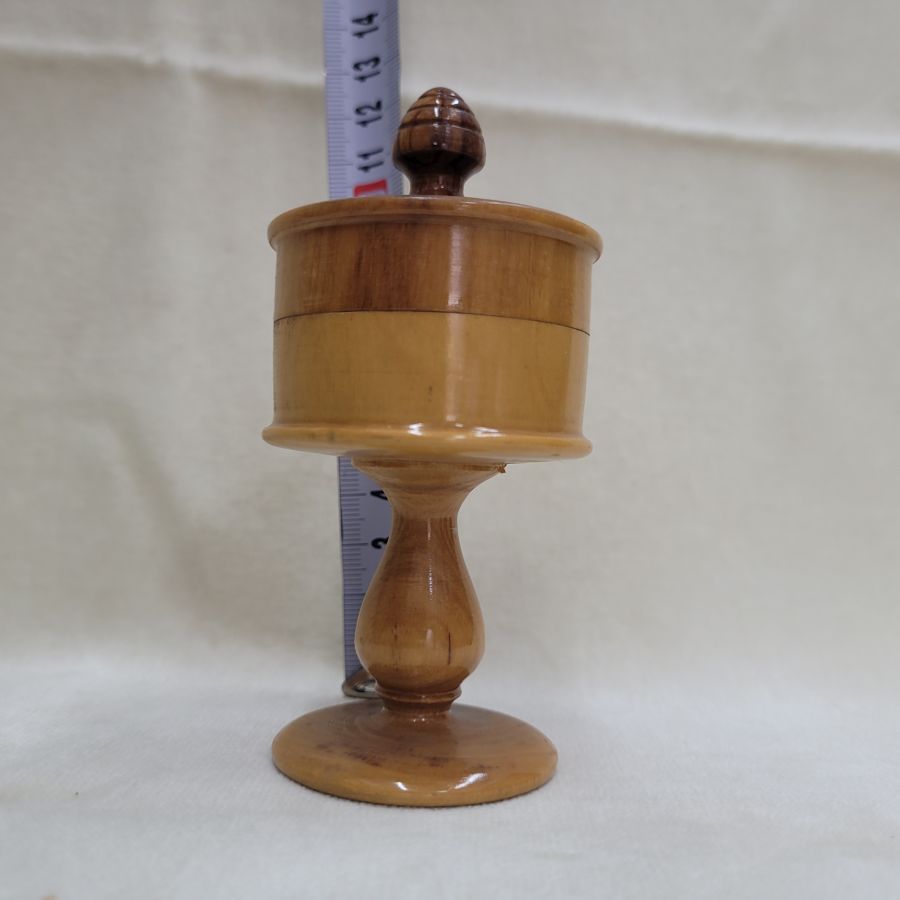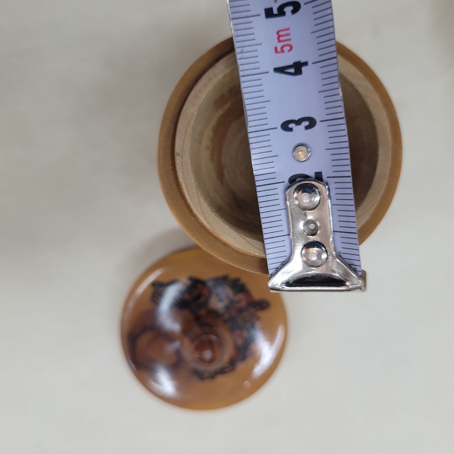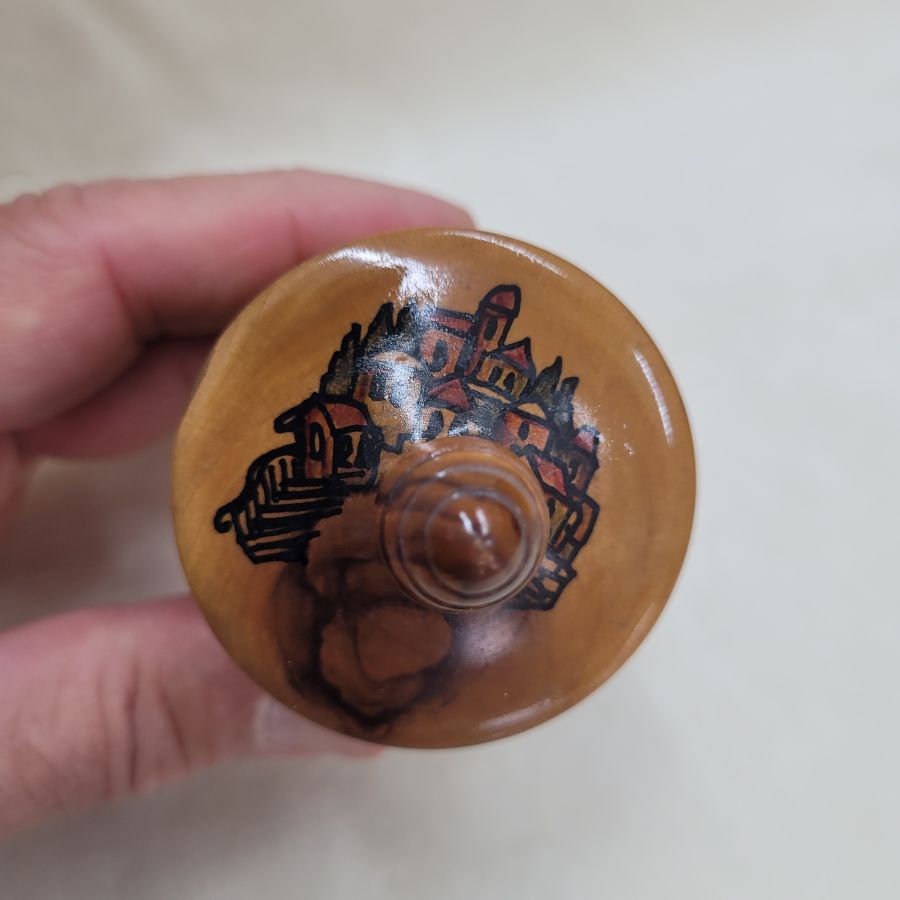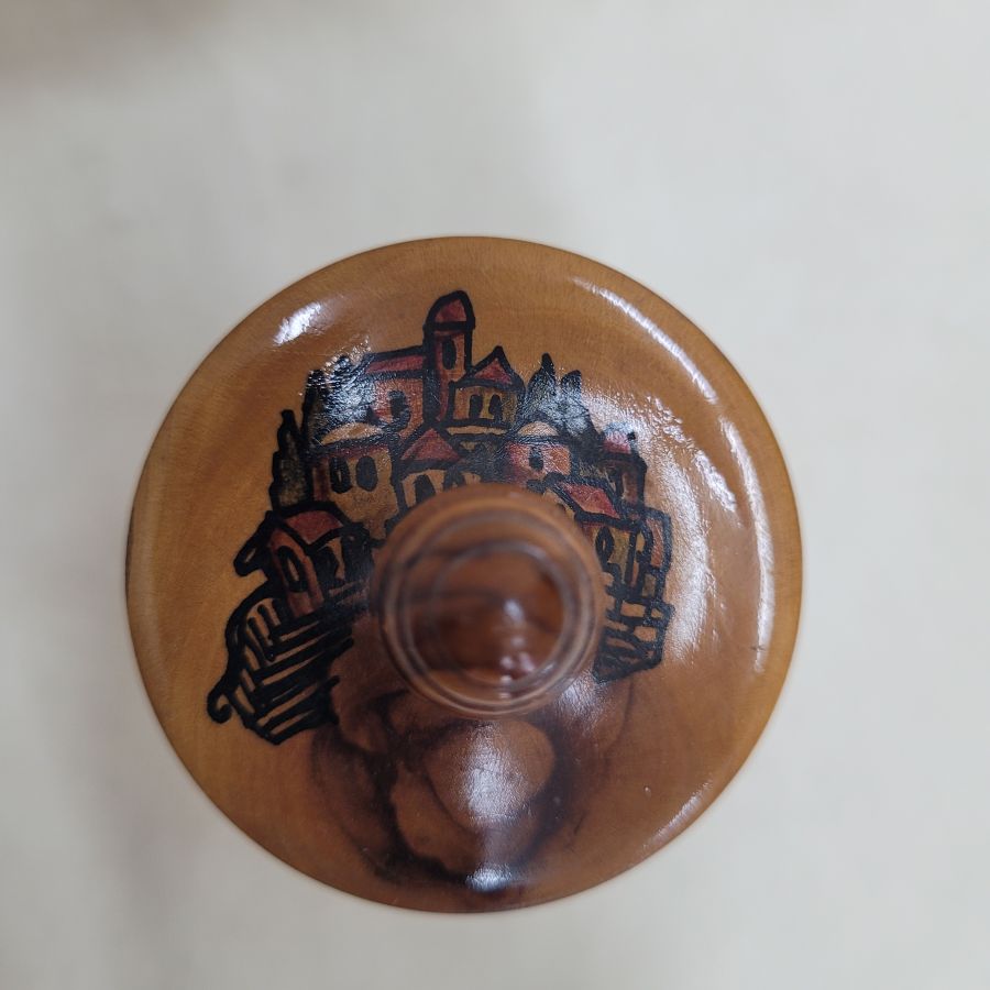 Handmade Havdalah olive wood box with Jerusalem hand painting. Havdalah olive wood box with Jerusalem houses hand painting designs on cover and has a stands. Dimension diameter 5 cm X 12 cm approximately.