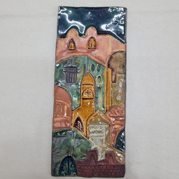 Ruth Factor glazed ceramic Jerusalem houses rectangular tile handmade. Handmade glazed ceramic Jerusalem houses rectangular tile with different Jerusalem houses in center.