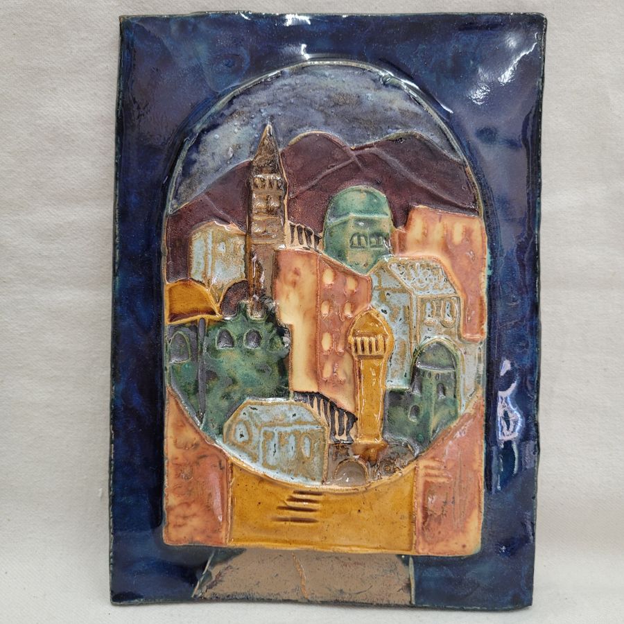 Ruth Factor glazed ceramic Jerusalem houses rectangular tile.