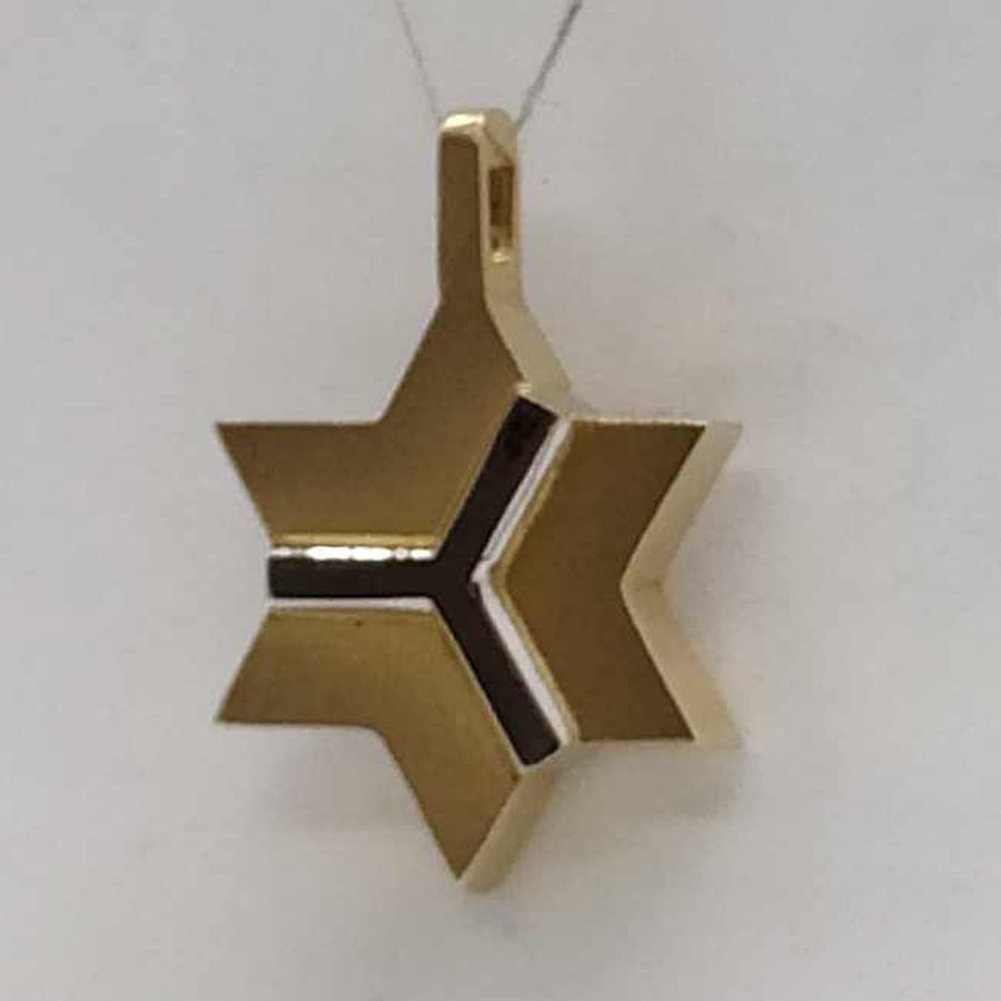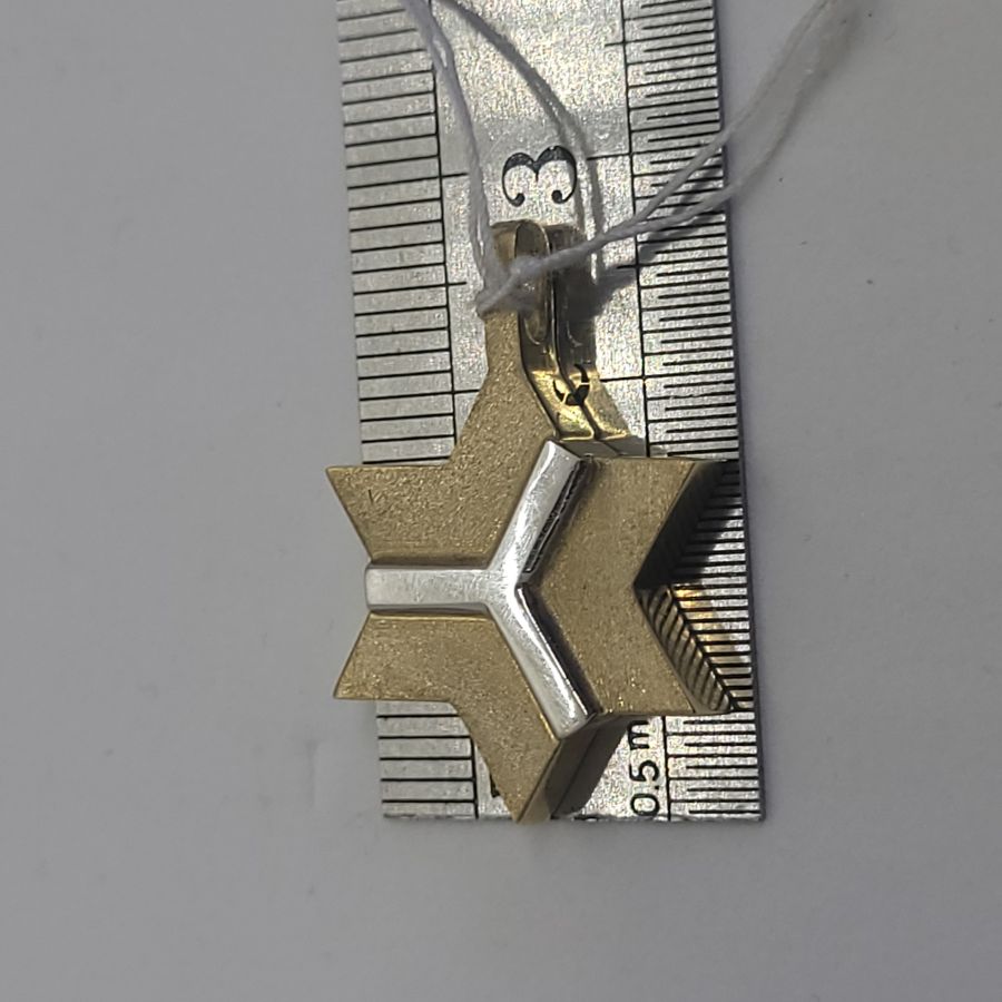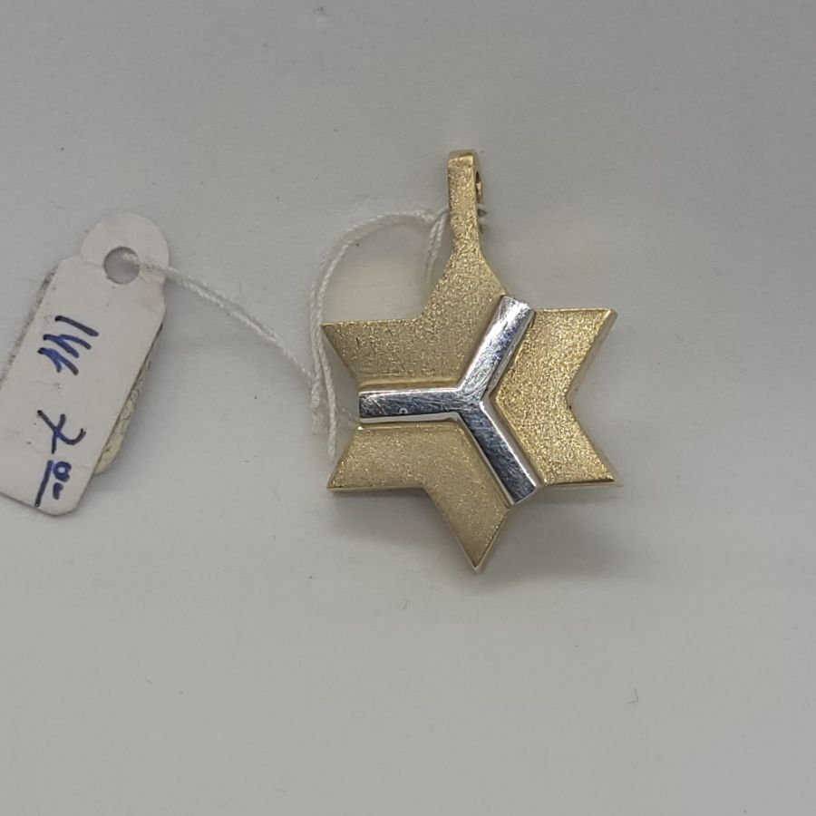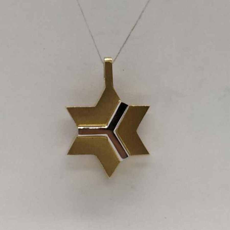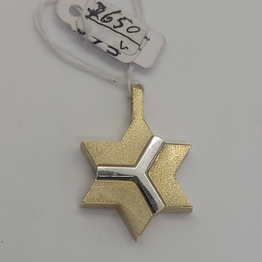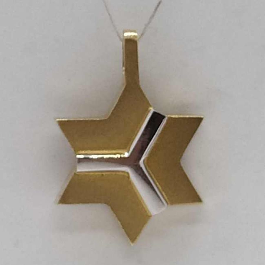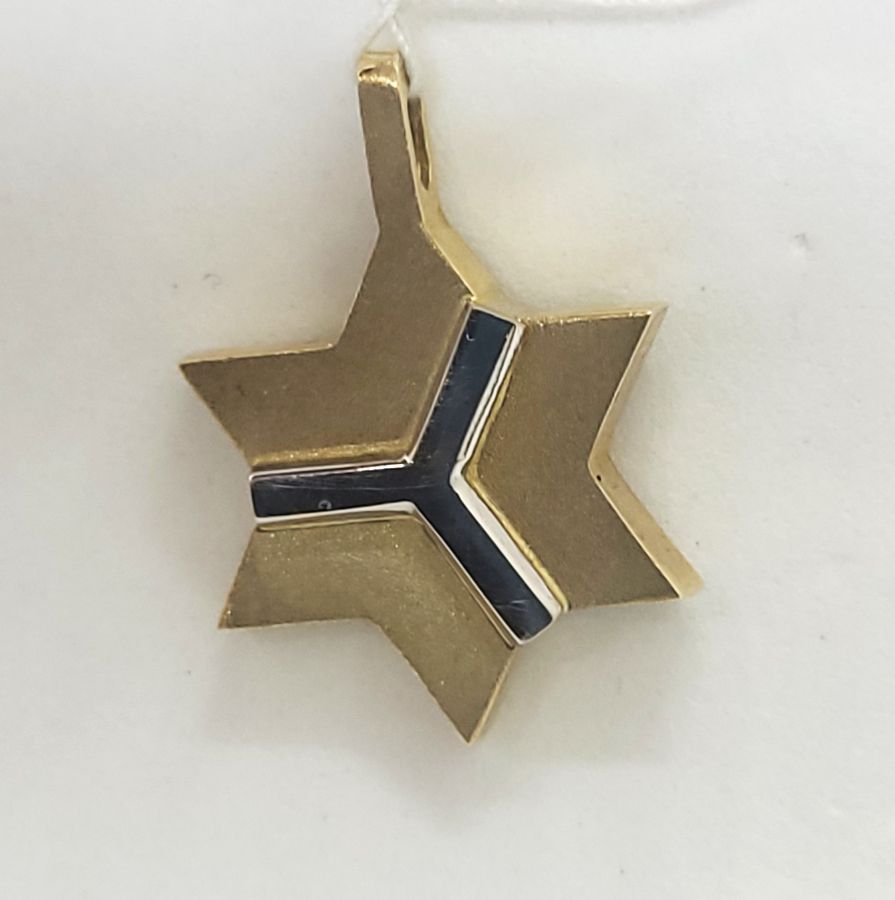 Handmade solid 14 carat white and yellow gold MagenDavid star pendant abstract. 14 Carat white and yellow gold MagenDavid star pendant abstract white design over & yellow gold massive look.