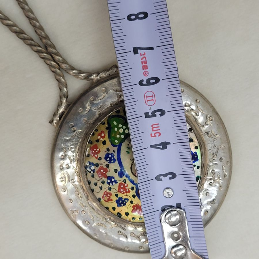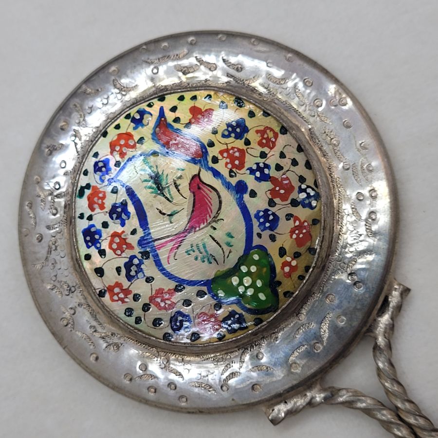 Vintage copper silver plated mirror lady’s hand bag from the Middle East. Handmade vintage copper silver plated mirror lady’s hand bag set with mother of pearl floral design hand painting made in the 1960’s.