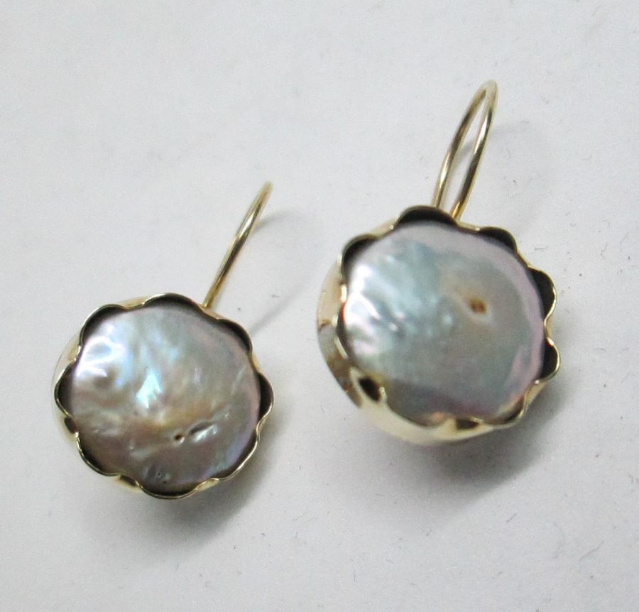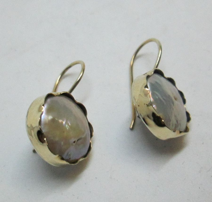 Handmade sterling silver Moby pearl earrings contemporary style & 14 carat gold set with genuine pearl. The hook in pearl Moby earrings contemporary style can not be changed to silver screw finding for non pierced ears. Dimension 1.4 cm X 1.3 cm approximately.