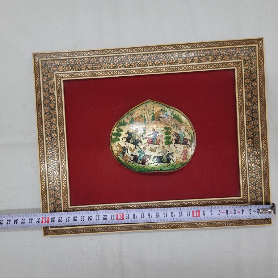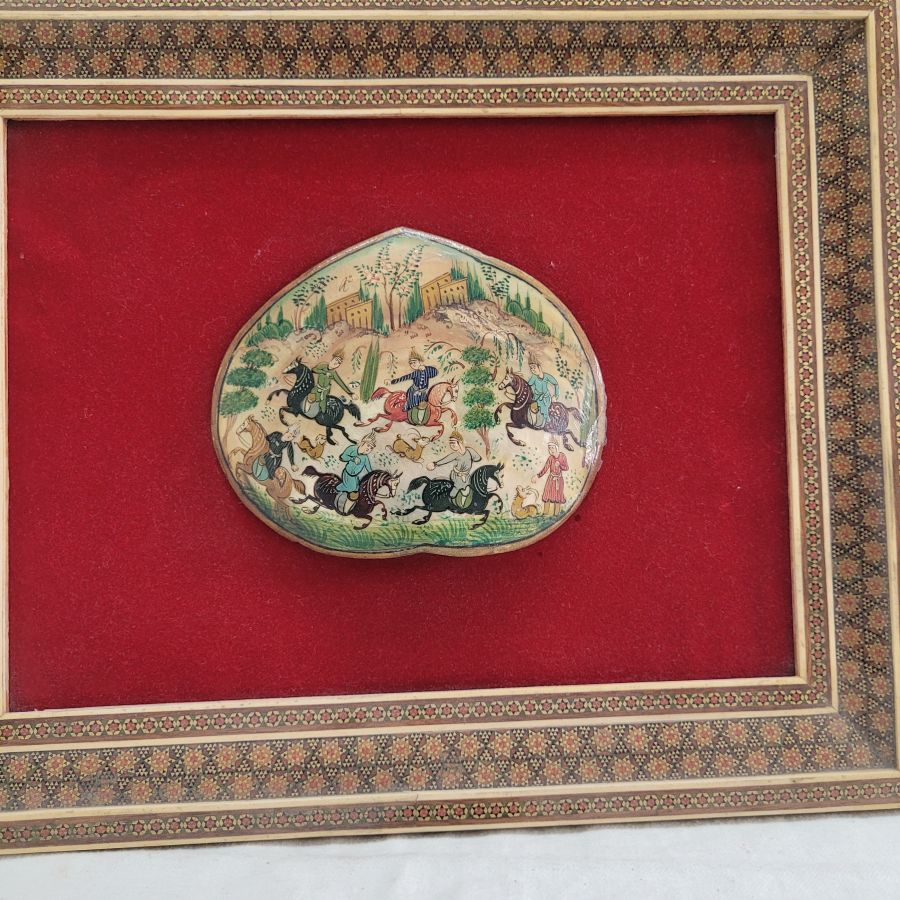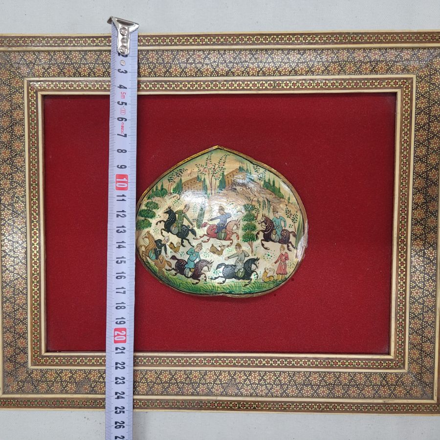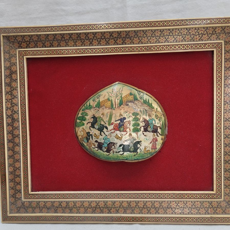 Vintage framed mother of pearl painting from the Middle East. Handmade vintage mosaic frame hand painting mother of pearl painting describing deer hunting, made in the 1950’s. The mosaic frame consists of many minuscule natural elements to form the mosaic designs.