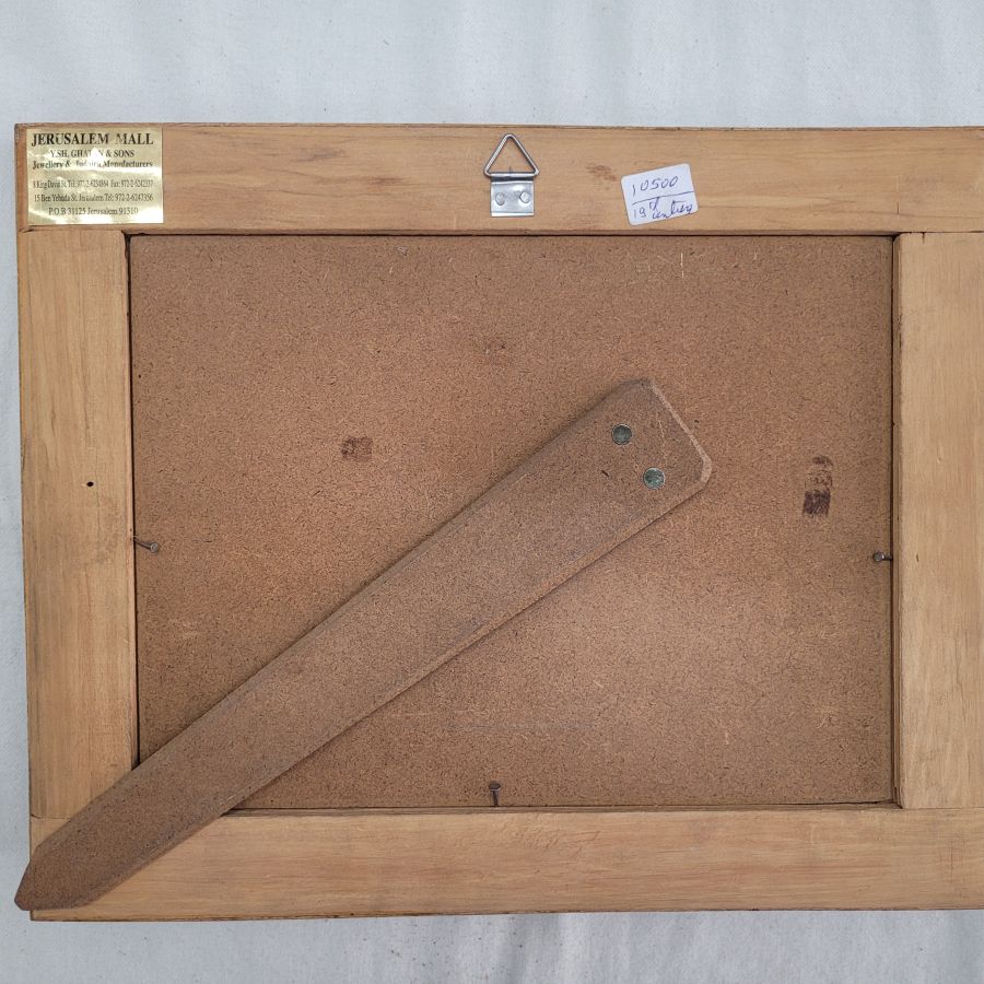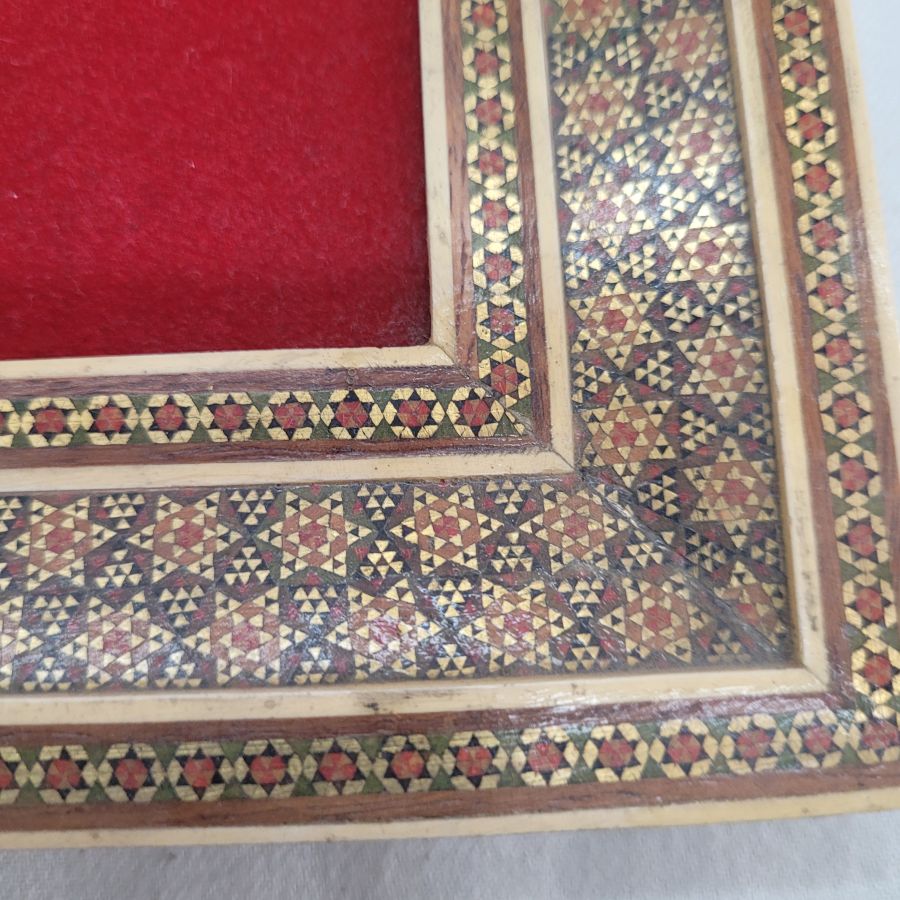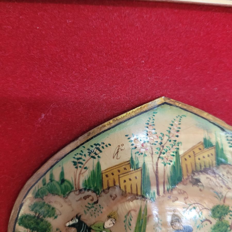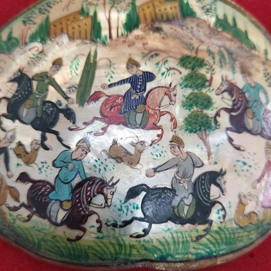Vintage framed mother of pearl painting from the Middle East. Handmade vintage mosaic frame hand painting mother of pearl painting describing deer hunting, made in the 1950’s. The mosaic frame consists of many minuscule natural elements to form the mosaic designs.