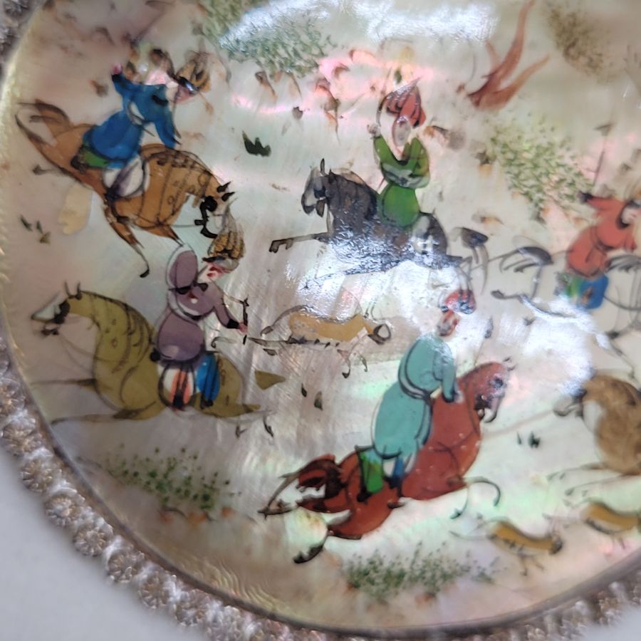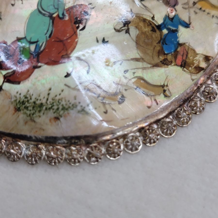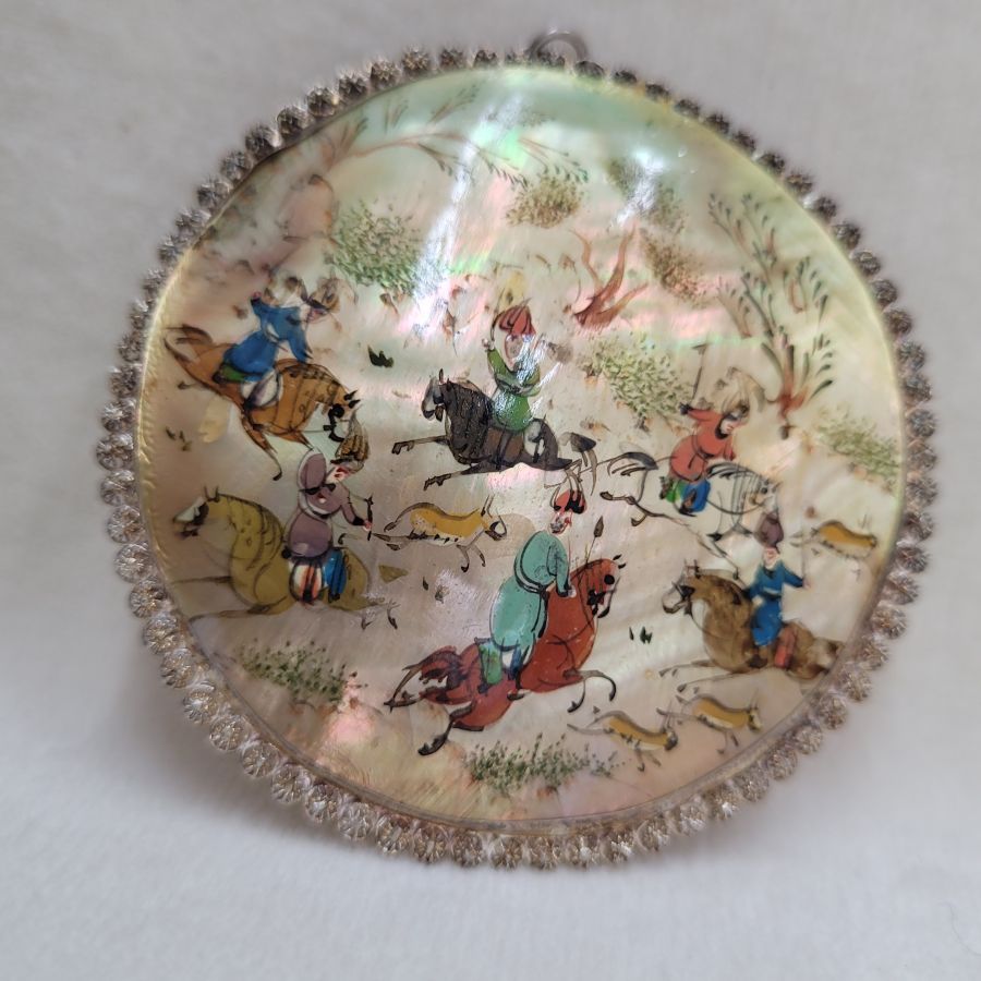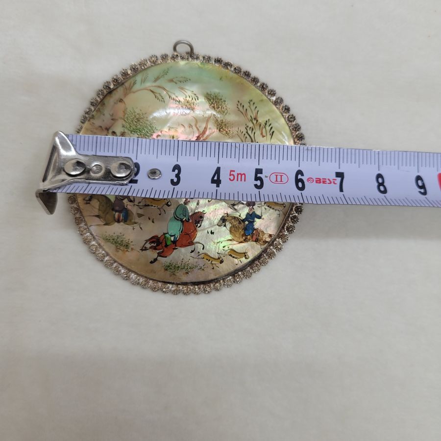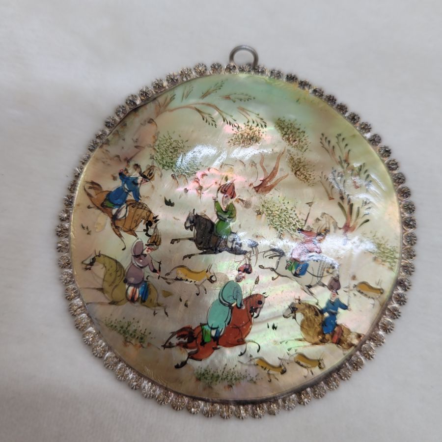 Vintage sterling silver mother of pearl pendant from the Middle East. Handmade vintage sterling silver mother of pearl pendant hand painting horsemen hunting deer made in the 1960’s.