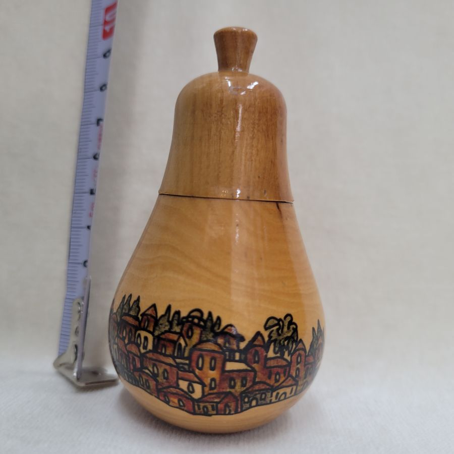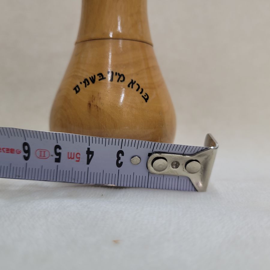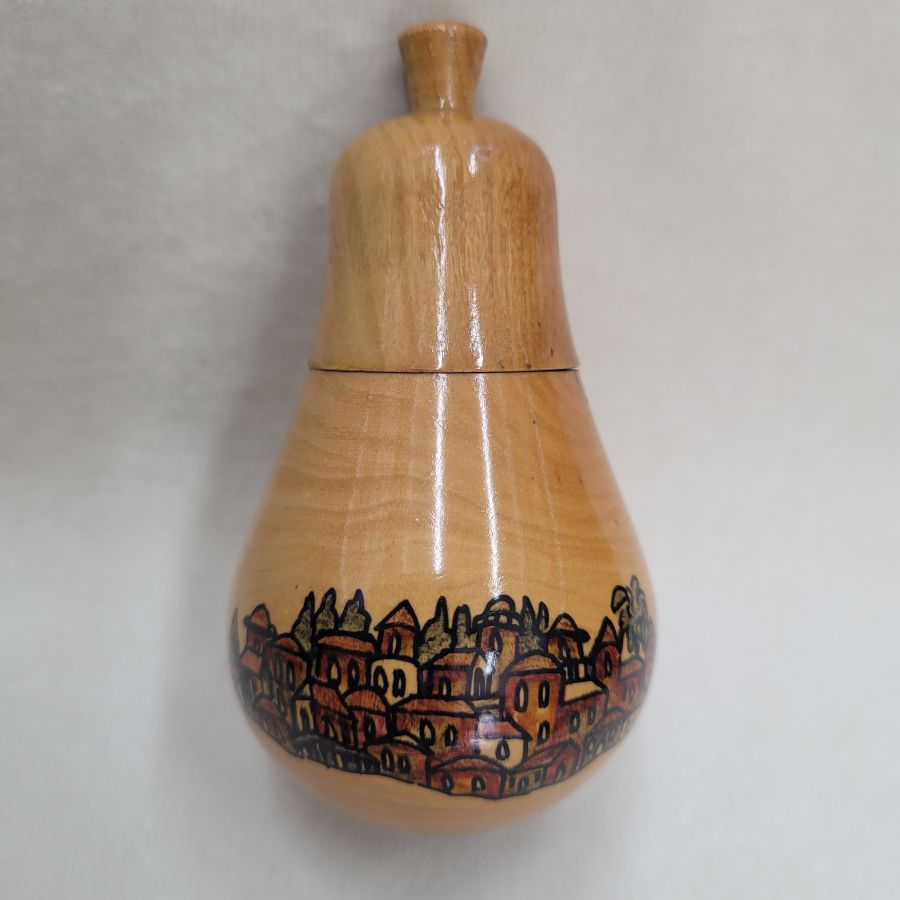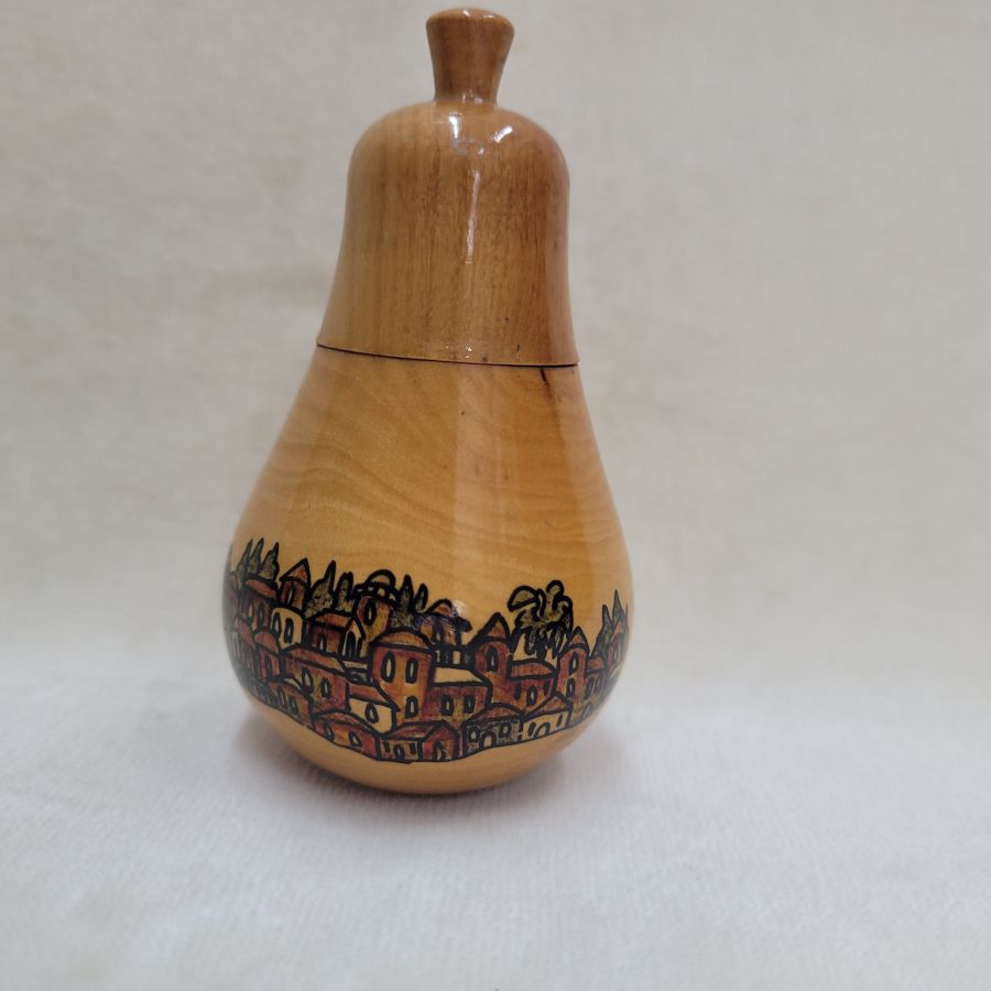 Handmade olive wood spice box pear shape on back written in Hebrew “בורא מיני בשמים”. Havdalah olive wood spice box pear shape with Jerusalem houses hand painting designs around. Dimension diameter 5.5 cm X 10.5 cm approximately.