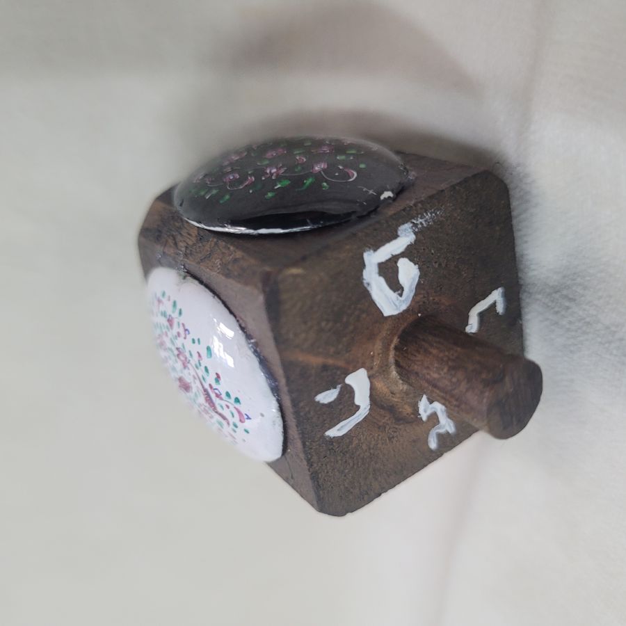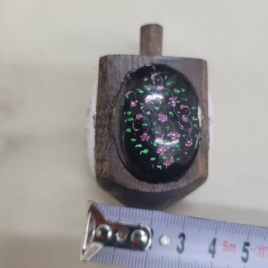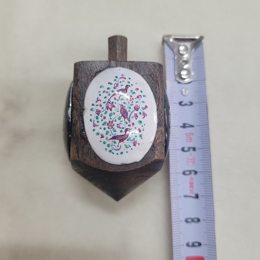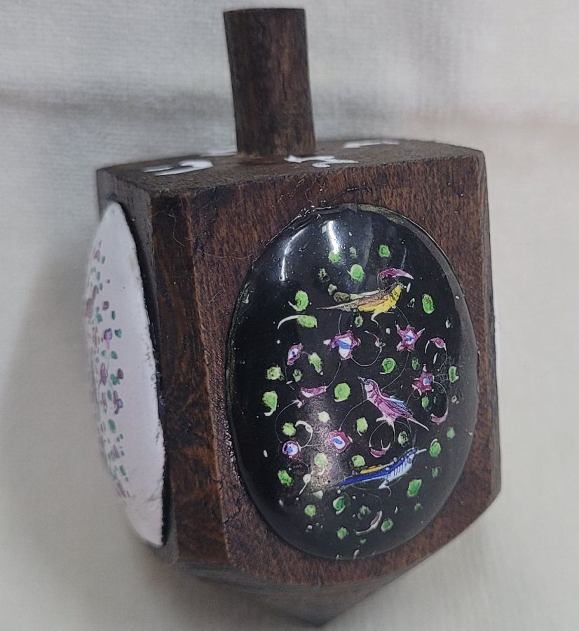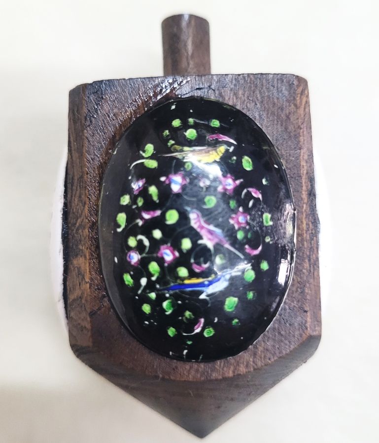 Chanuka Hanukah oval shape enameled Dreidel wood handmade. Handmade Hanukah oval shape enameled Dreidel with floral and birds designs on wood Dreidel. Made by S. Ghatan ( Katan).