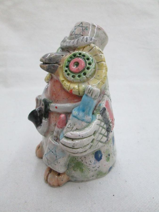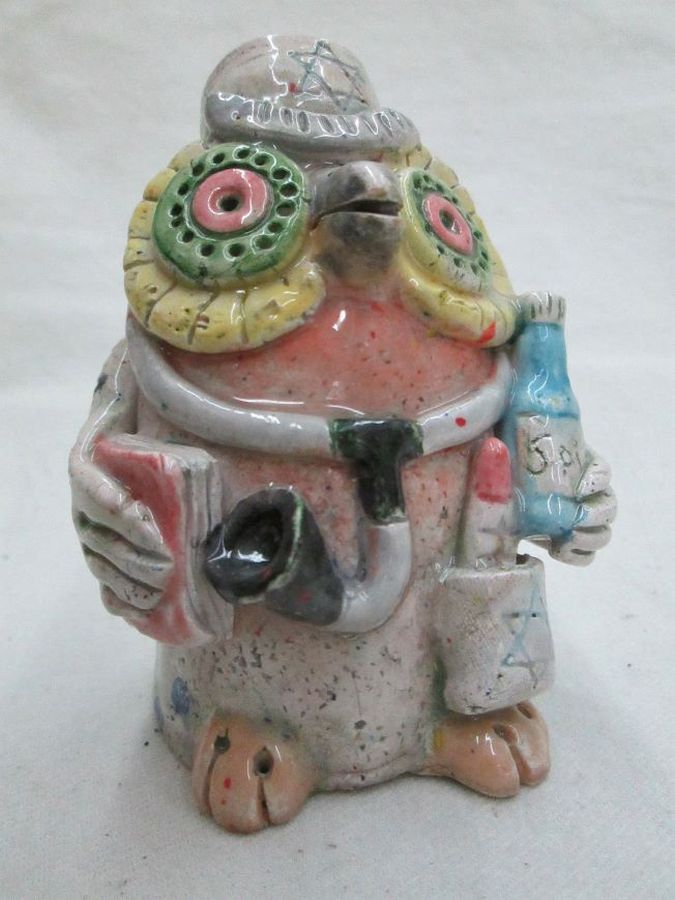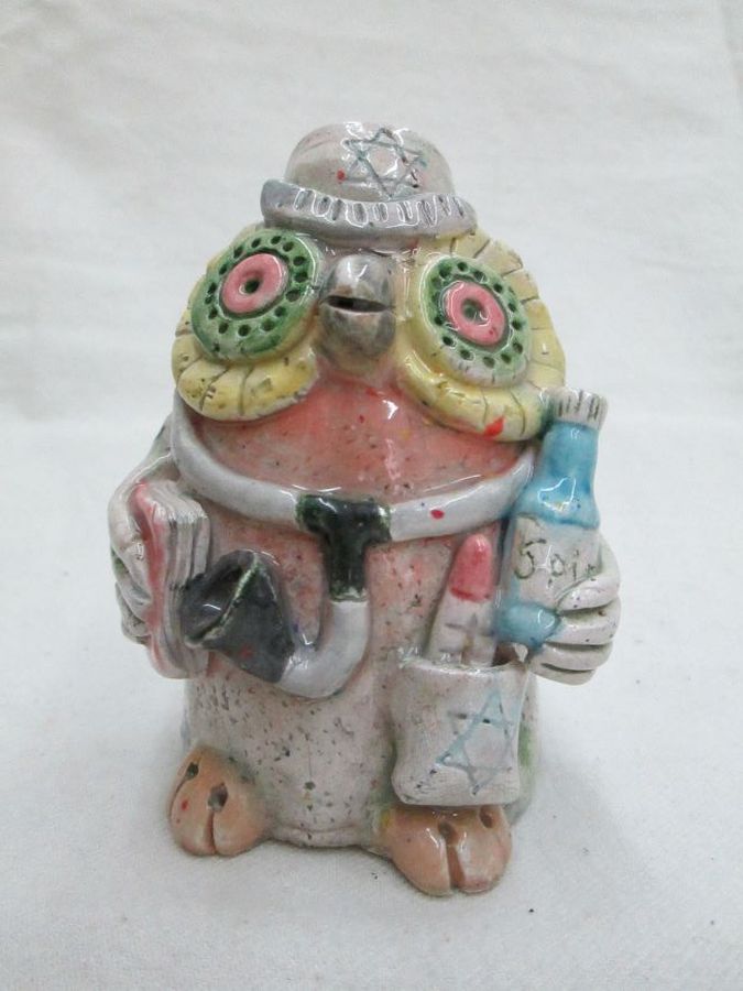 Owl glazed ceramic sculpture as a Jewish owl doctor handmade. Handmade owl glazed ceramic sculpture Jewish owl doctor made by T. Labok. Dimension 6.3 cm X 6.8 cm X 9.2 cm approximately.