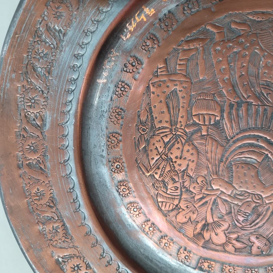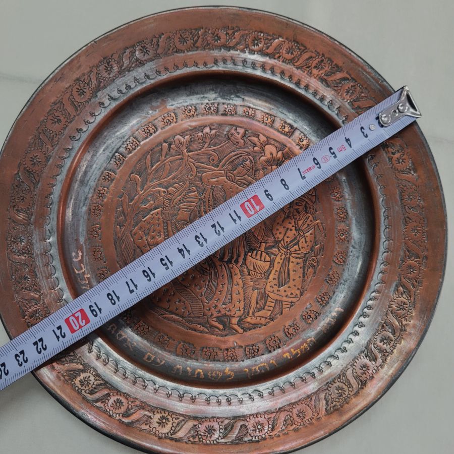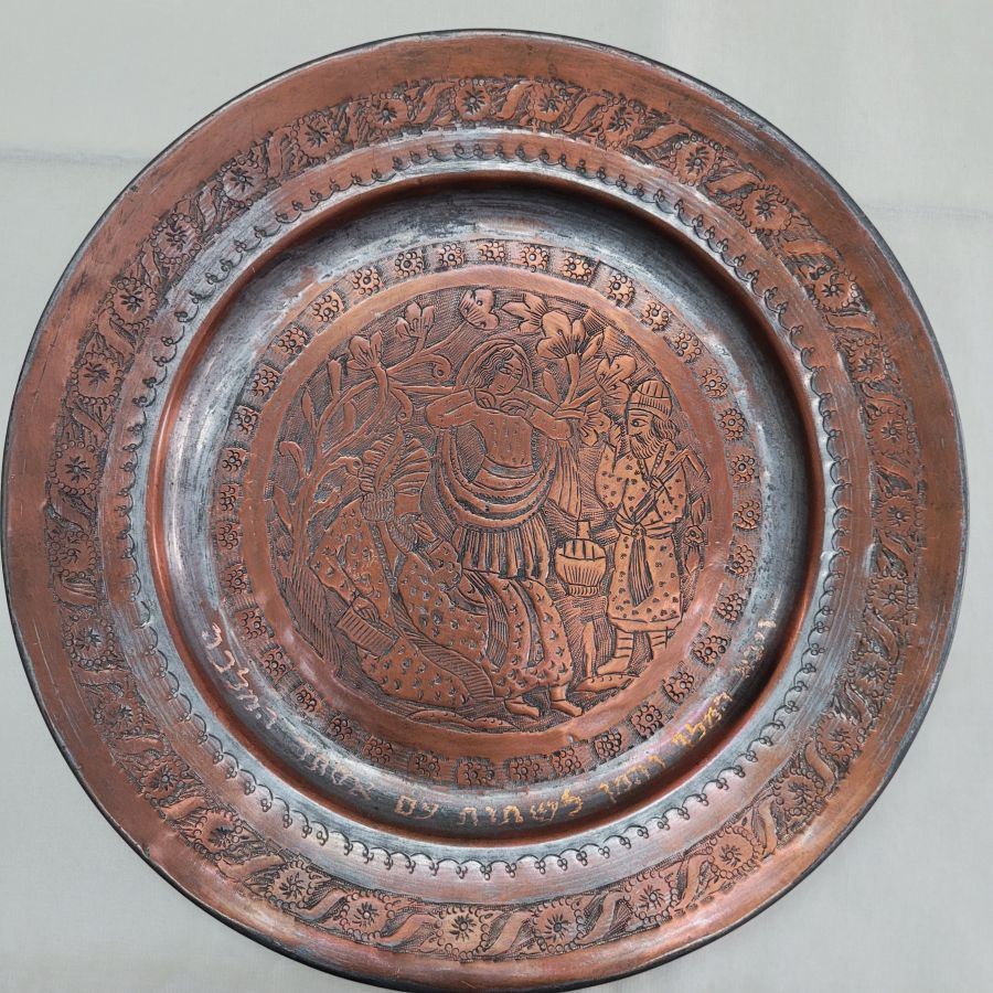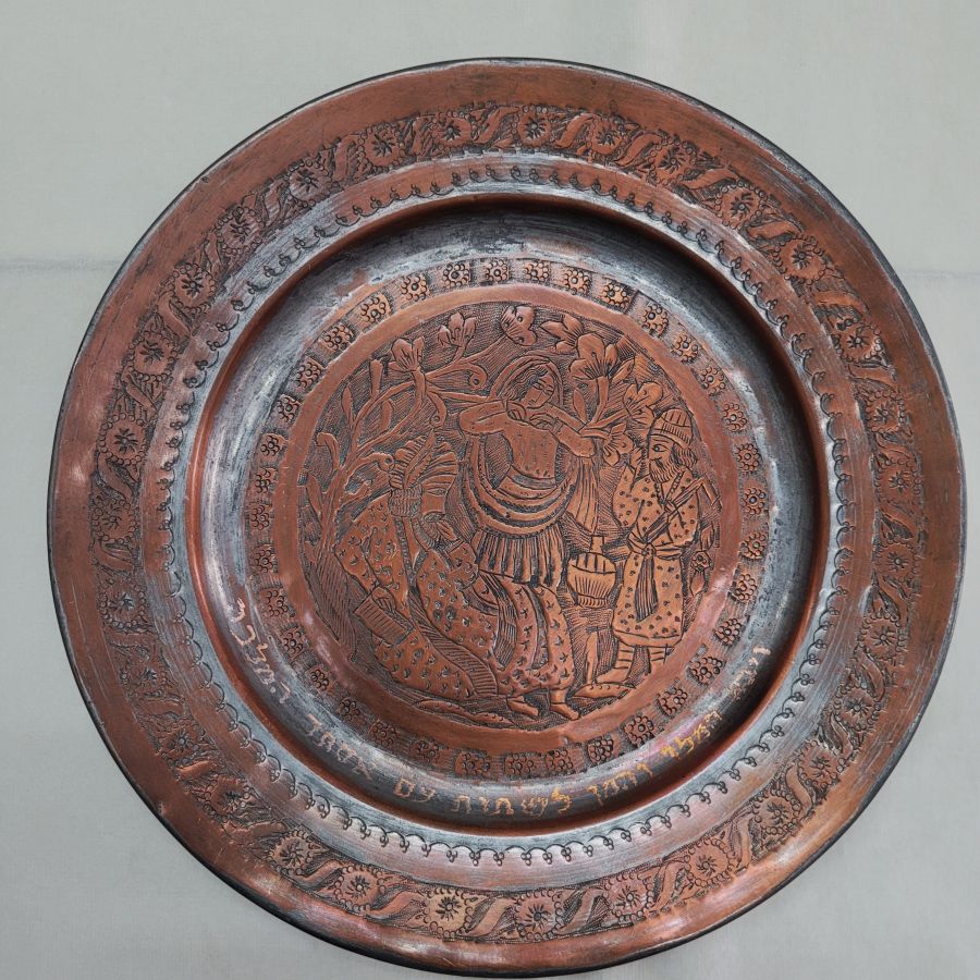 Queen Esther vintage dish copper handmade by a middle east emigrant to Israel early 1950’s. Handmade copper Queen Esther vintage dish is engraved ” ויבוא המלך והמן למשתה אשר הכינה אסתר” ” The king & Haman have come to Esther feast” in Hebrew and hand hammered design of the feast. Dimension diameter 23 cm approximately.