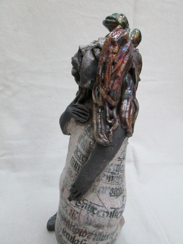 Roku Ceramic Miss Piggy sculpture. Handmade glazed Roku Ceramic Miss Piggy with a frog lying on her head, after she made her beloved charming prince into a frog made by S. Factor .