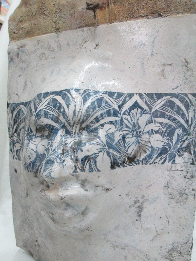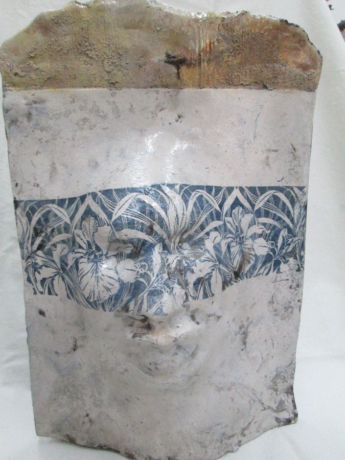 Roku Ceramic Sculptured Face handmade. Handmade glazed Roku Ceramic Sculptured Face mask with flowers by S. Factor. Roku ceramic is based on Japanese ancient ceramic tradition involving high temperature and fine ceramic grains.