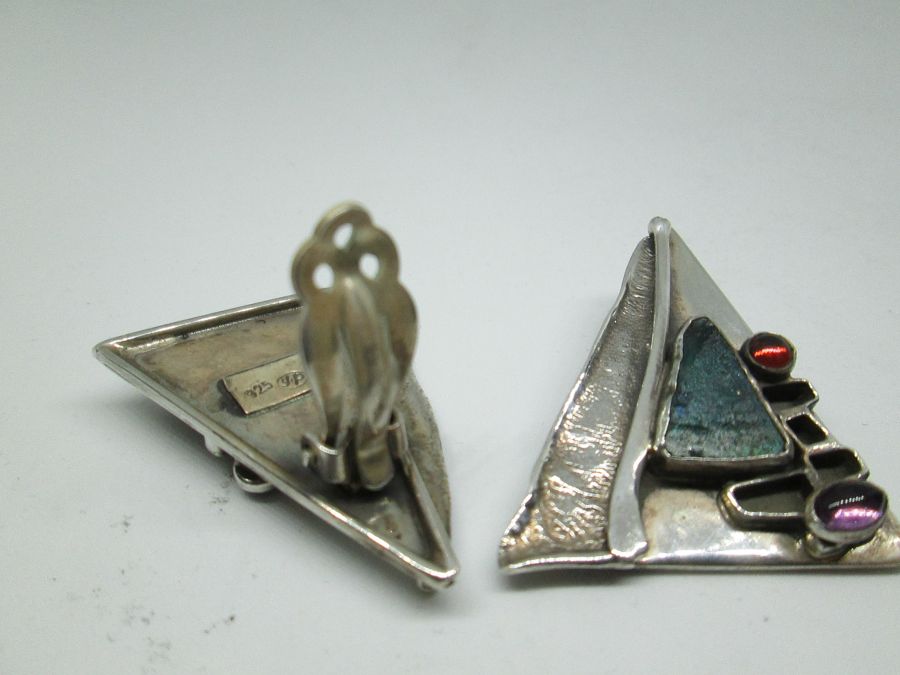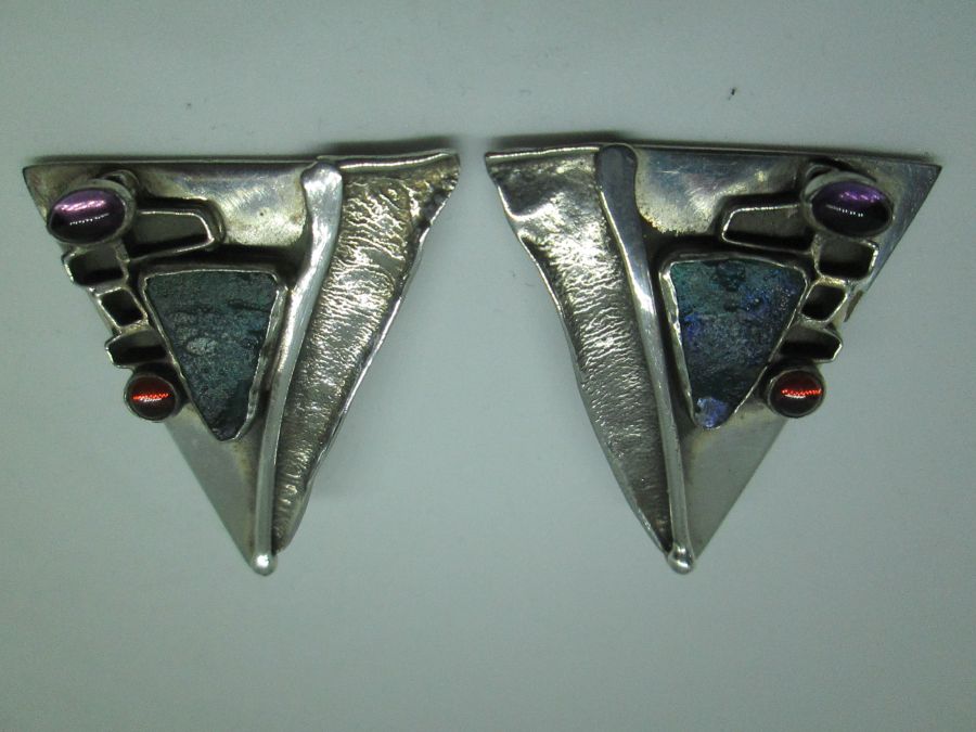 Handmade sterling silver earrings triangle shape contemporary design made by Y. Perez set with genuine Roman glass & garnet & Amethyst stones. Silver earrings triangle shape is clip on earrings for non pierced ears. Dimension 3.3 cm X 3.6 cm approximately.
