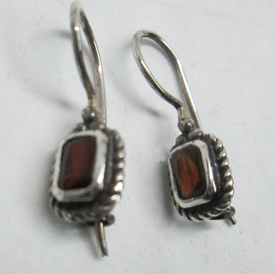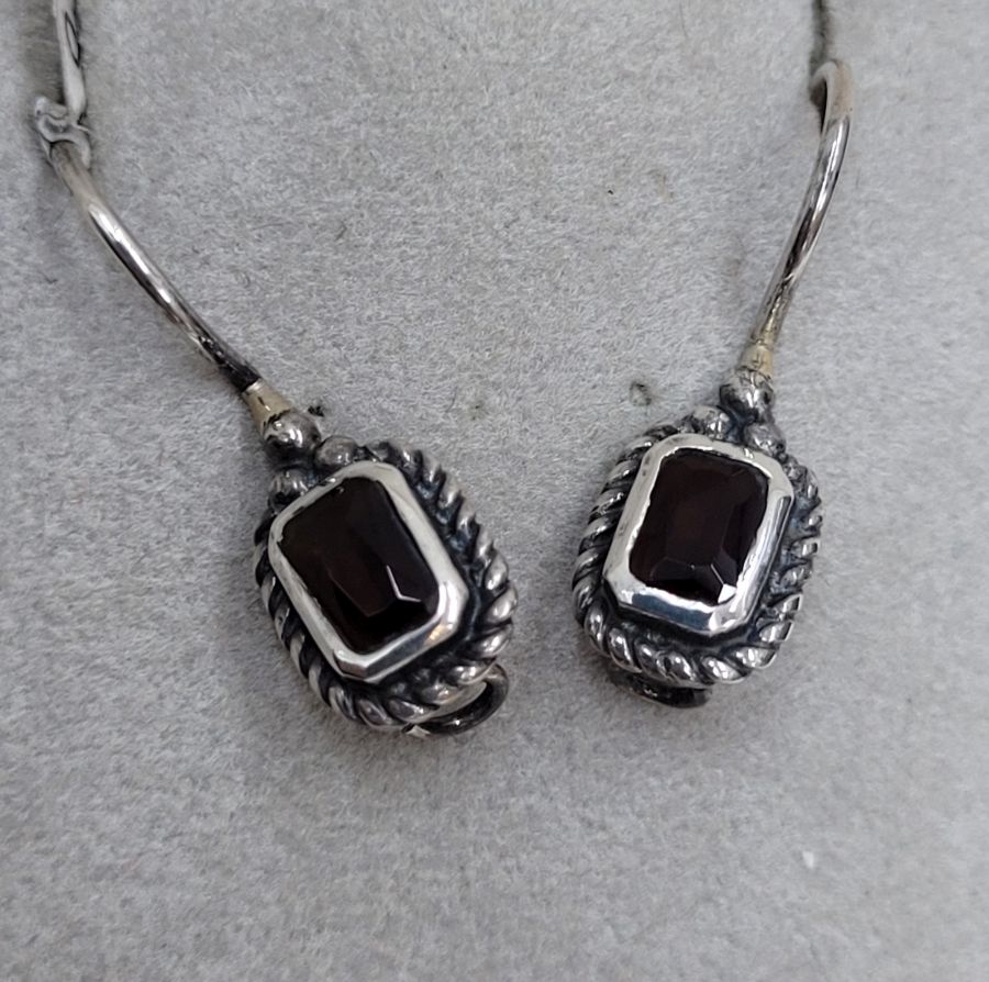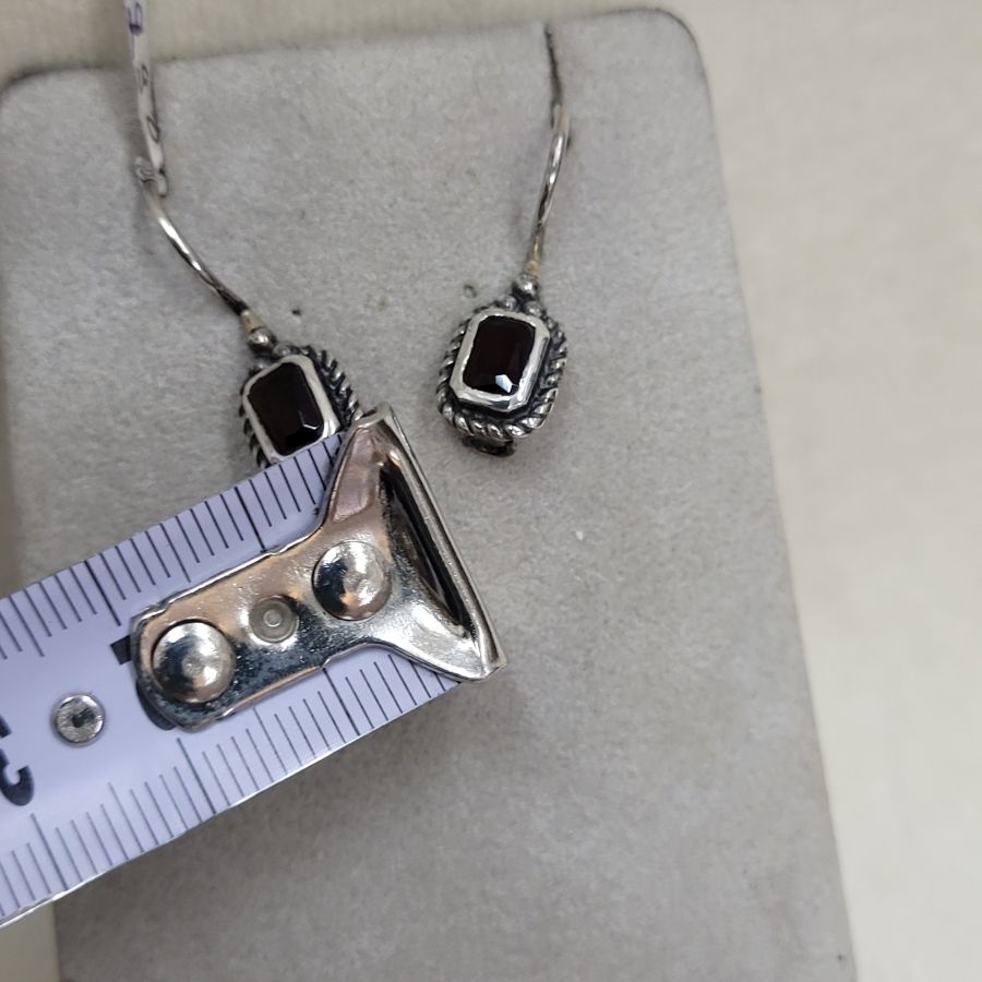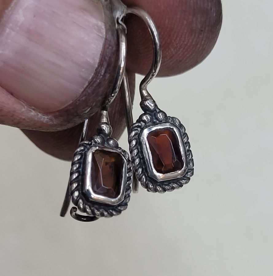Handmade sterling silver earrings two Garnets stones faceted Garnets contemporary style. The hook in sterling silver earrings two Garnets stones can not be changed to screw finding for non pierced ears. Dimension 1.35 cm X 1.5 cm approximately.