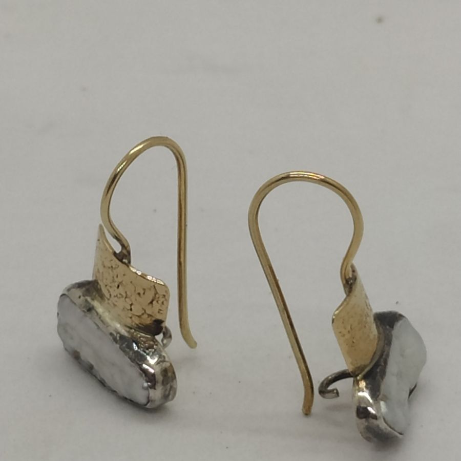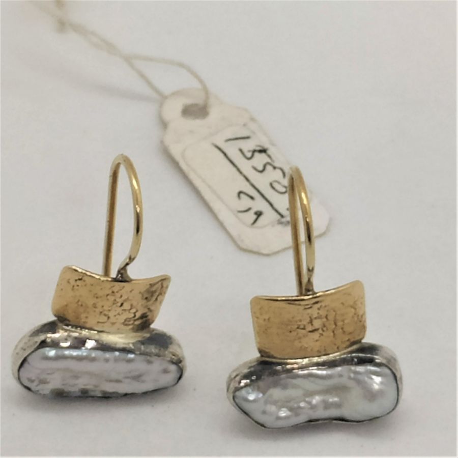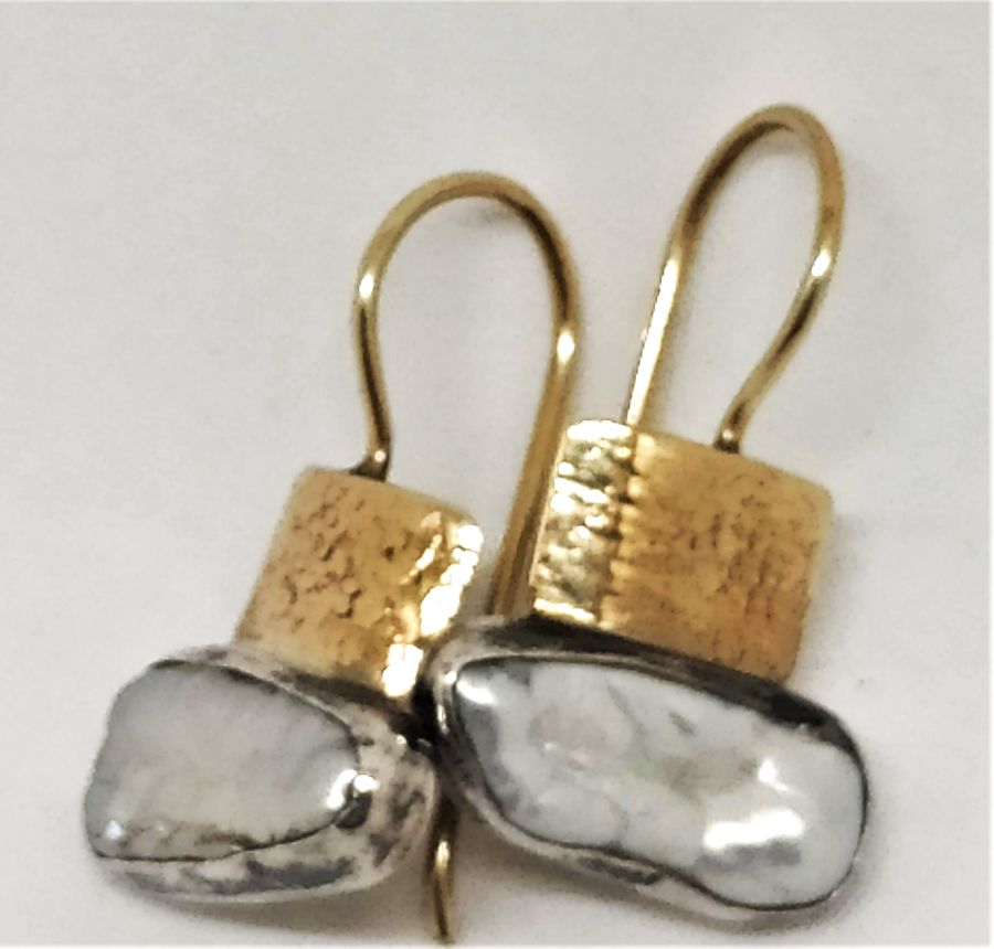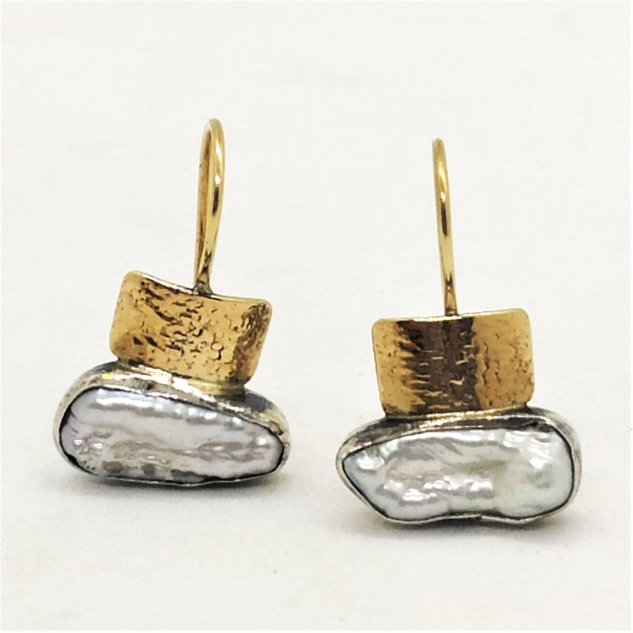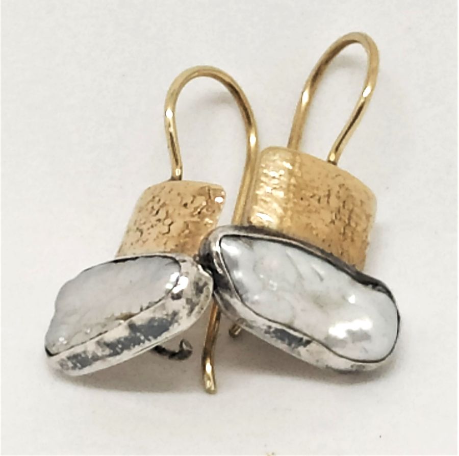 Handmade 14 carat gold and sterling silver Moby pearl earrings contemporary style, 14 carat gold hand hammered set with white Moby pearl. Sterling silver Moby pearl earrings can not be altered to none pierced ear lobe. Dimension 2.5 cm X 1.5 cm approximately.
