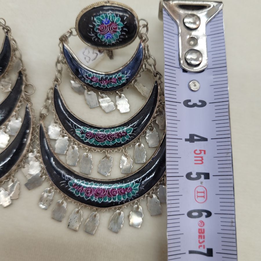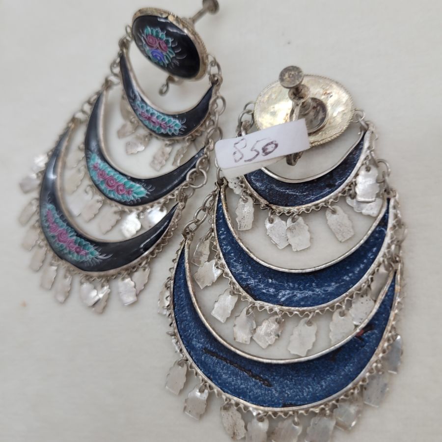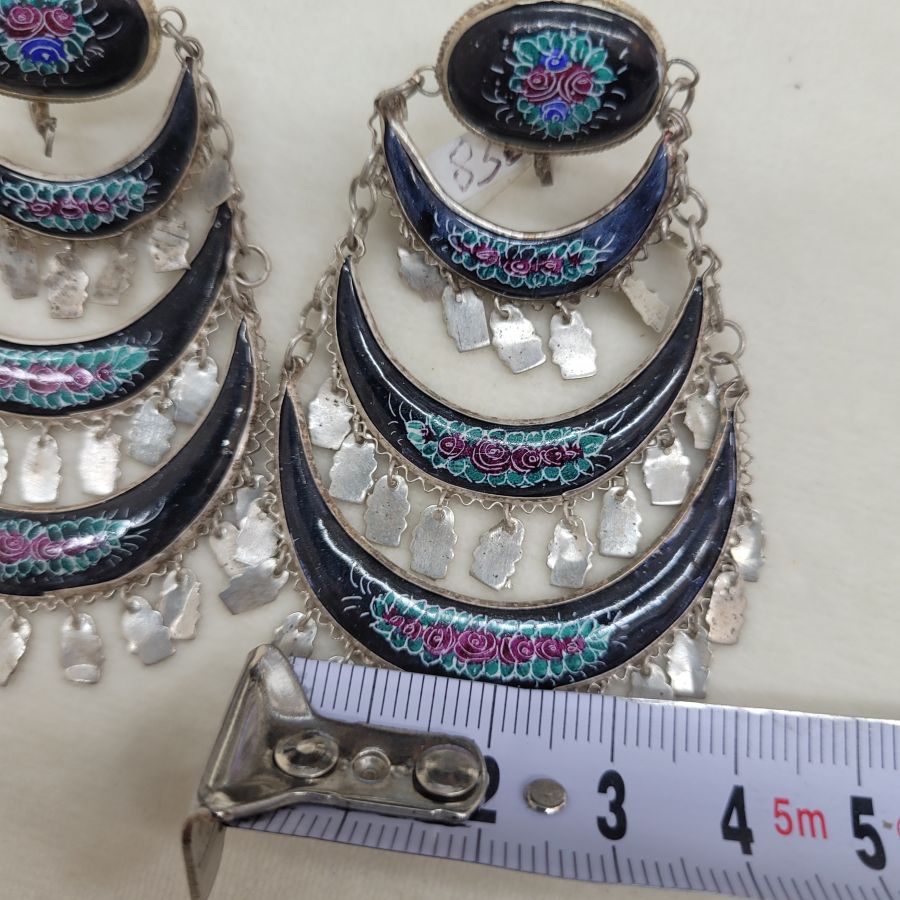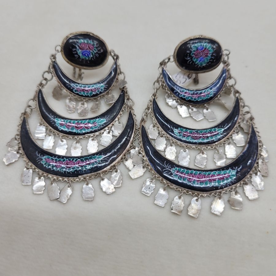 Vintage black enamel earrings handmade. Handmade jewelry vintage black enamel earrings enameled birds & foliage designs set in sterling silver Yemenite filigree crescent shape.