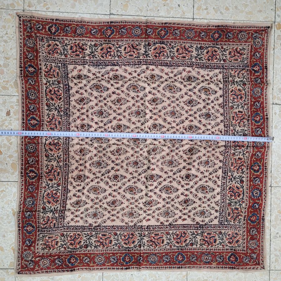 Vintage floral Qalamkari tablecloth handmade. Handmade square cotton vintage floral Qalamkari tablecloth, where are beautiful designs because of the different flowers and geometrics skillfully used made in the Mideast 1940’s.