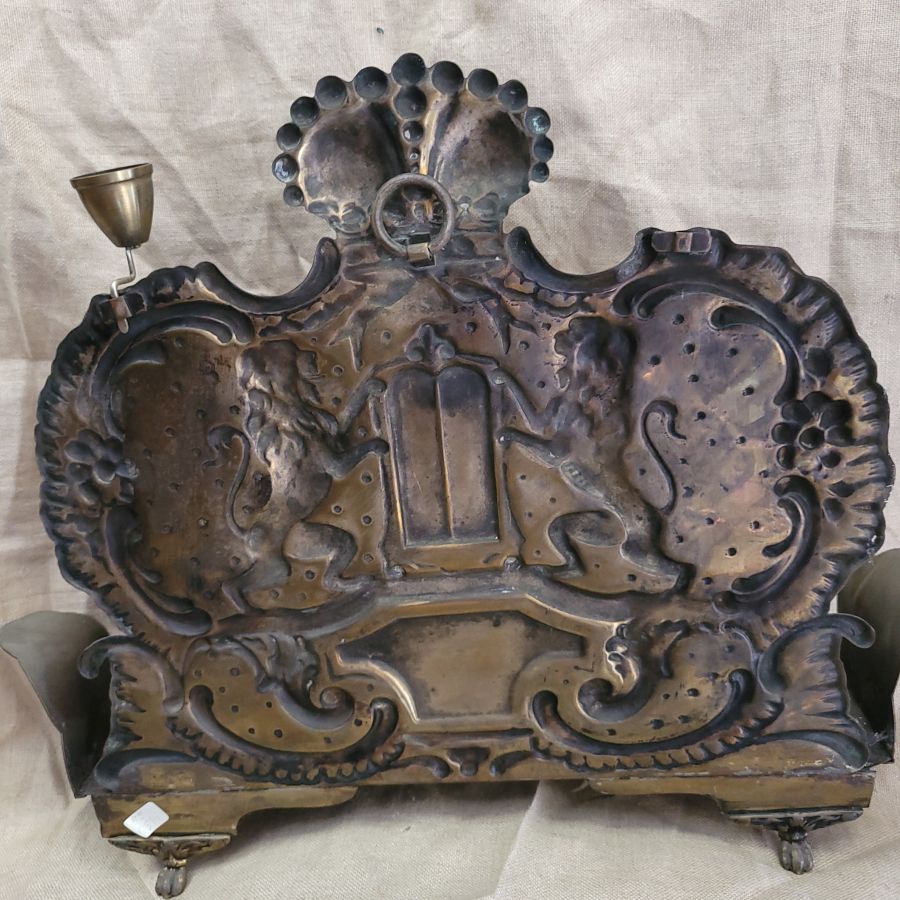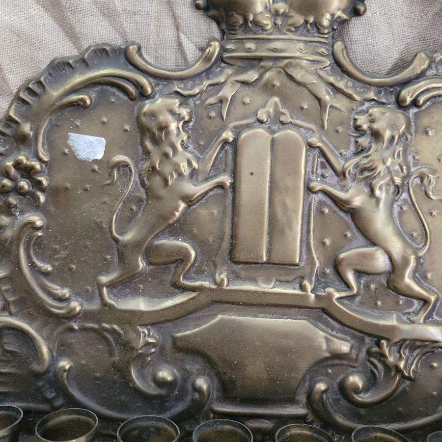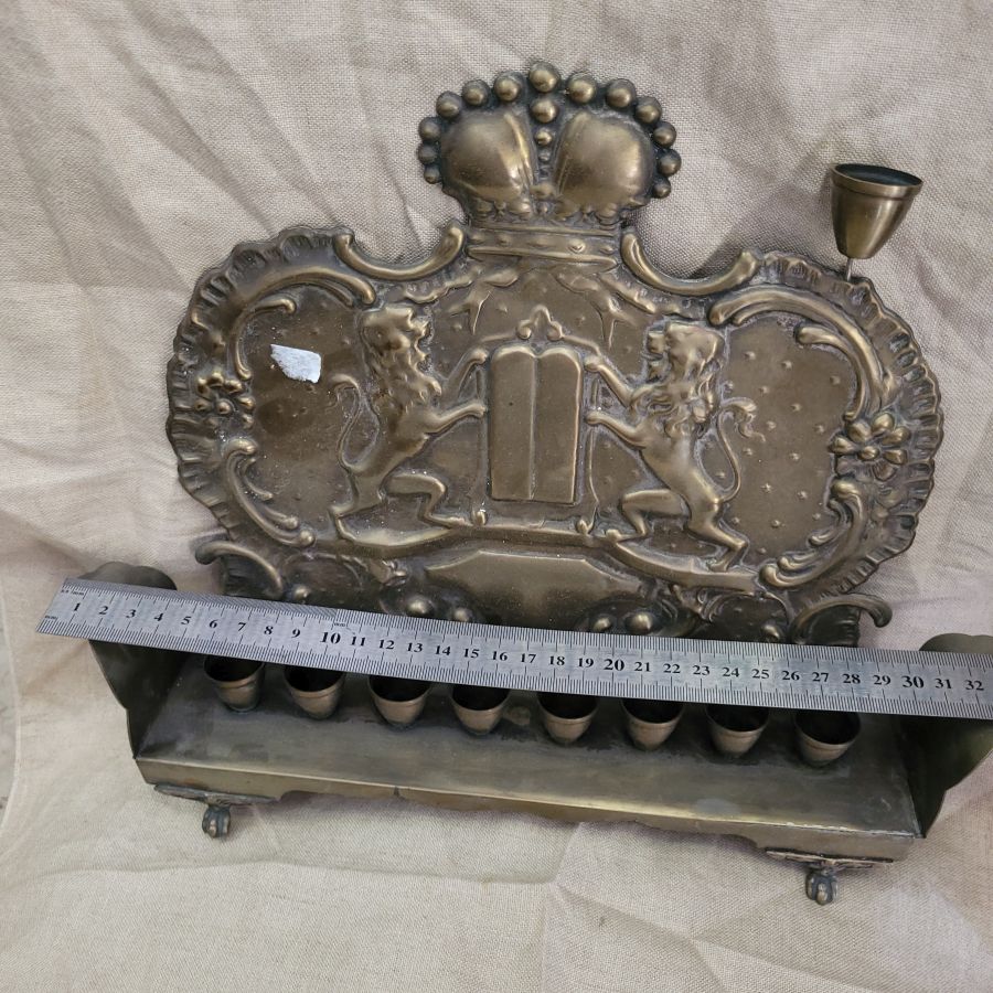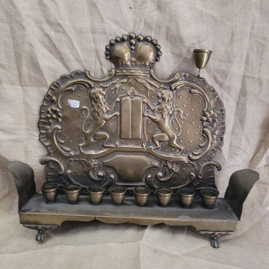 Vintage Hanukah Menorah brass handmade. Vintage Hanukah Menorah brass, Bezalel style handmade in Poland 19th century with two lions of Judah embossed. It has been cleaned and buffed from actual oil remaining.